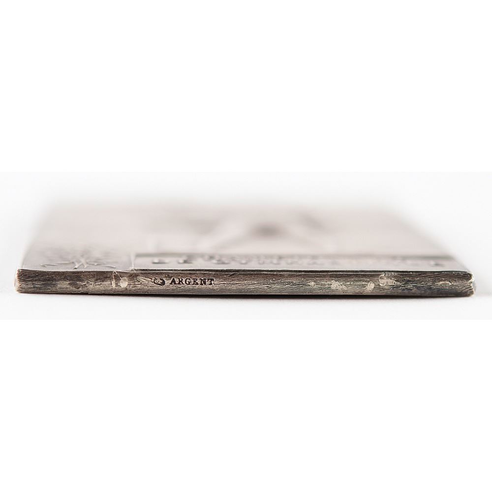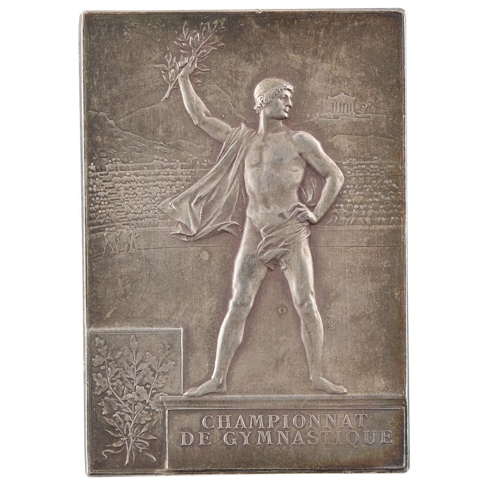 Rare winner’s medal issued for the Paris 1900 Olympics. Solid silver, 57 gm, 38 mm x 57 mm, by Frederic Vernon, Paris. The front, inscribed “Republique Francaise, Exposition Universelle, Paris 1900,†features a winged goddess scattering laurels over the grounds of the Exposition; the reverse identifies the sport as gymnastics, “Championnat de Gymnastique,†and depicts a victorious athlete upon a podium with a stadium and the Acropolis in the background. Stamped “Argent†on an edge.