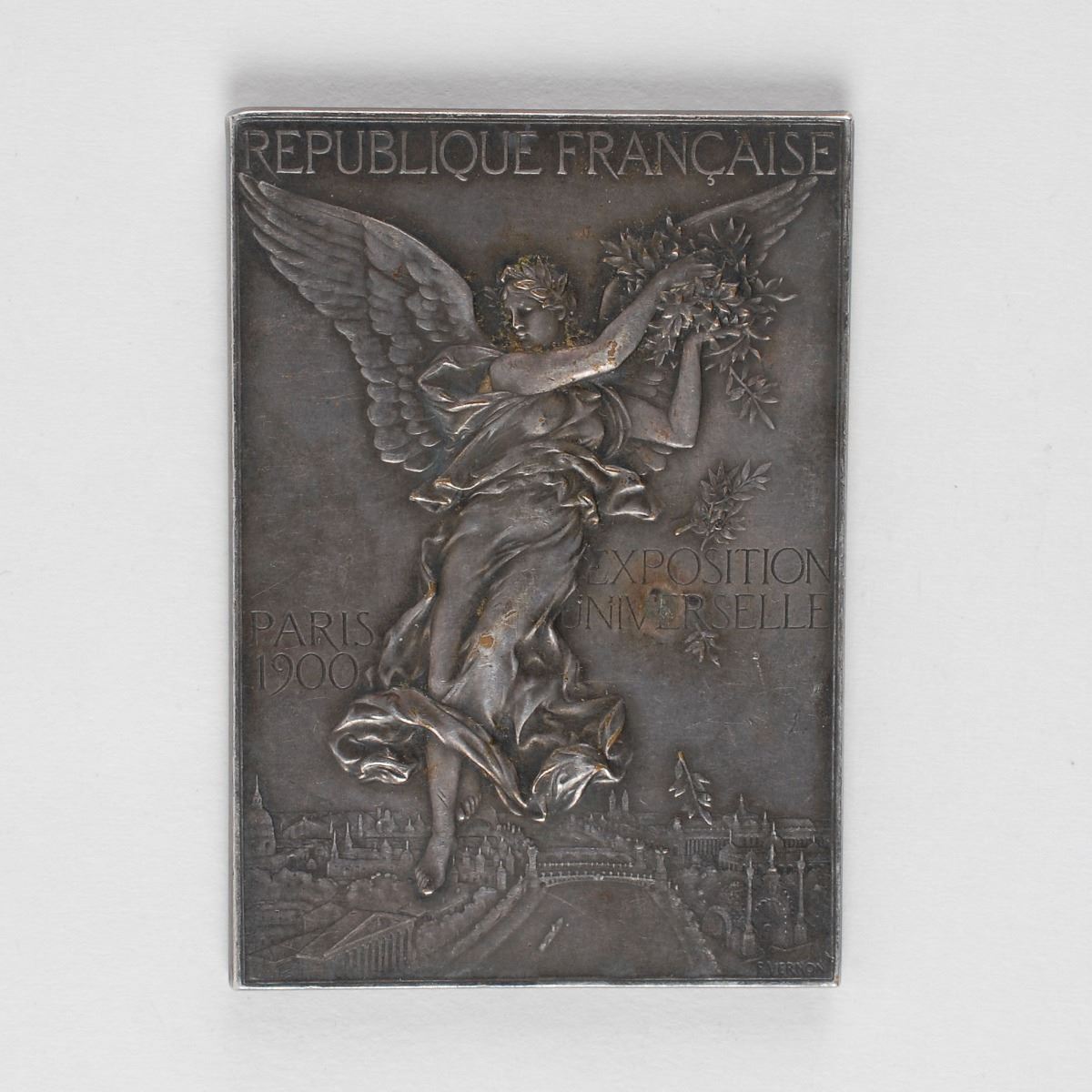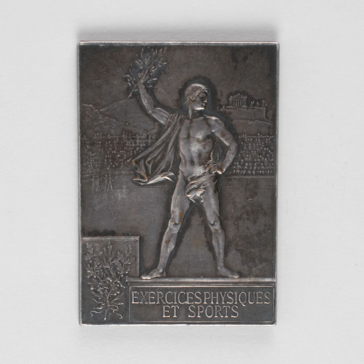 Winner’s medal issued for the Paris 1900 Summer Olympics. Silvered bronze, 40 mm x 58 mm, 57 gm, by Frederic Vernon, Paris. The front, inscribed “Republique Francaise, Exposition Universelle, Paris 1900,” features a winged goddess scattering laurels over the grounds of the Exposition; the reverse identifies the sport as physical exercise and sports, “Exercices Physiques et Sports,” and depicts a victorious athlete upon a podium with a stadium and the Acropolis in the background. Stamped “Bronze” on an edge.