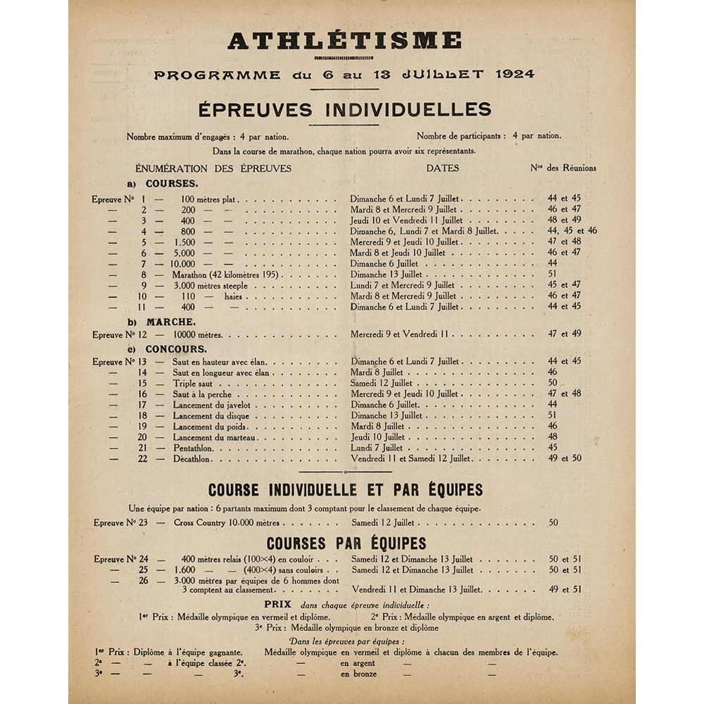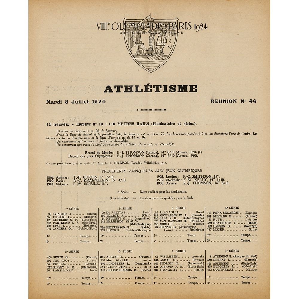 Scarce official French-language daily program from the Paris 1924 Summer Olympics for Athletic events held on Tuesday, July 8th. The program, 12 pages, 8.75 x 10.75, lists the day’s events as 110-meter hurdles, long jump, 200-meter, shot put, 800-meter, 5000-meter, and 200-meter. The program also features results, a schedule, and a lengthy list of participant names; the front cover bears some ink notations. In very good to fine condition, with light toning, handling wear, and faint intersecting folds.