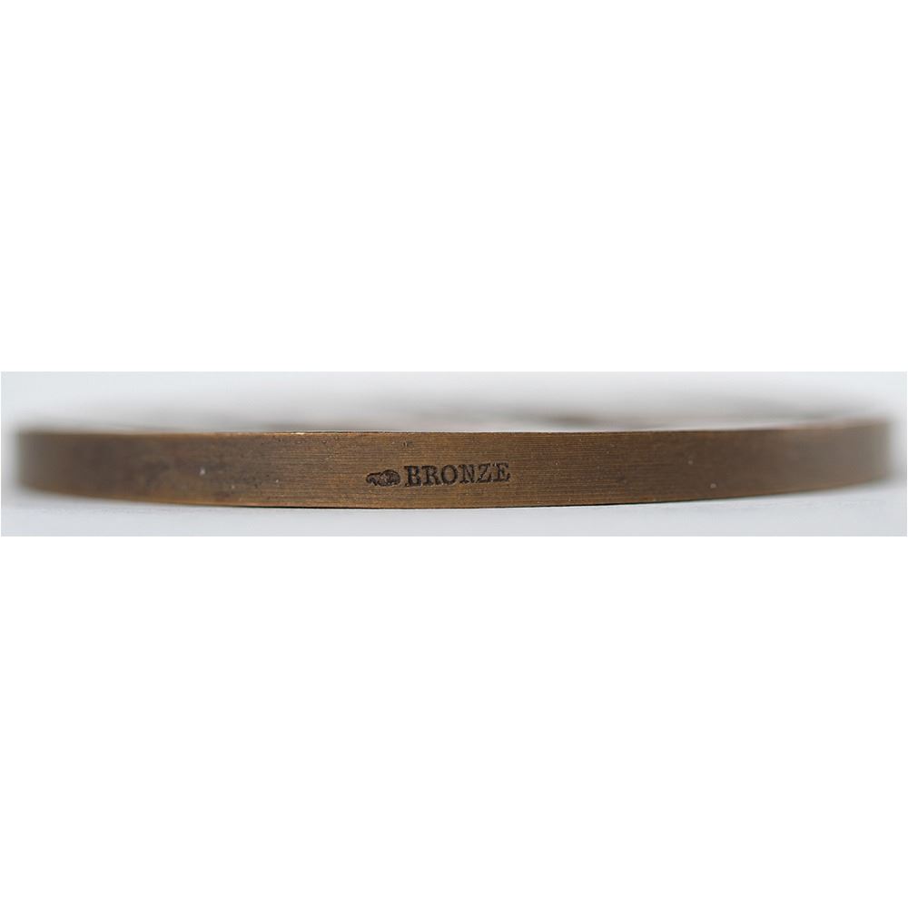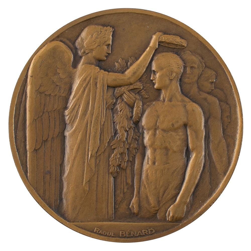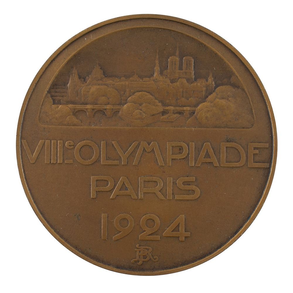 Decidedly clean example of a participation medal issued for the Paris 1924 Summer Olympics. Bronze, 55 mm, 72 gm, by Raoul Benard. The front features a stunning raised depiction of the goddess Nike crowning victorious athletes with laurel wreaths; the reverse bears a city view of Paris and raised text, “VIIIe Olympiade, Paris, 1924,†with the designer’s monogram below.