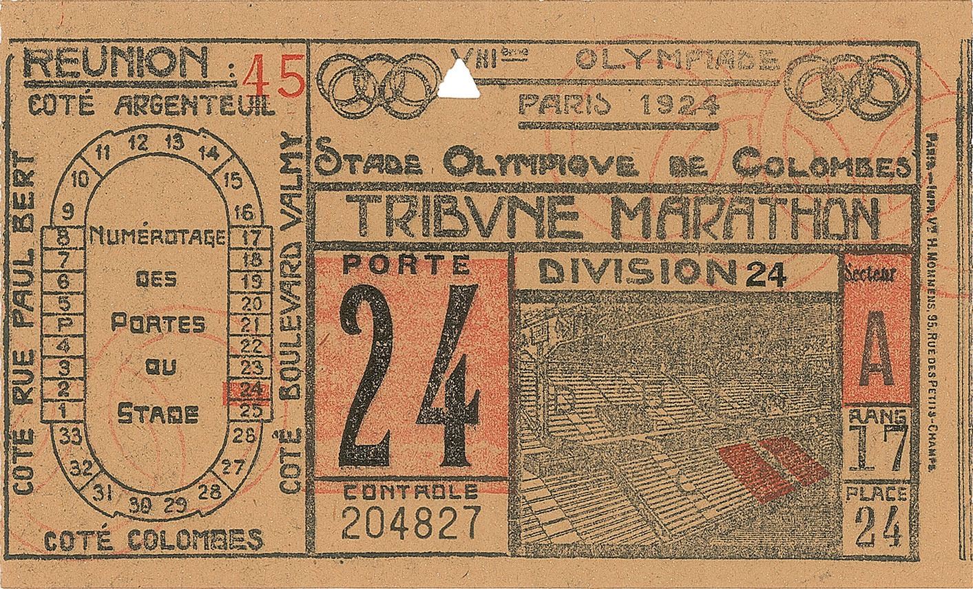Official 'Marathon Stand' admittance ticket for the Paris 1924 Summer Olympics, 5.25 x 3, stamped "45" with Olympic rings, and highlighted areas for door "24" and section, "A." Left side of ticket features an overhead view of the Colombes Olympic Stadium for 'the numbering of doors.' In very good to fine condition.