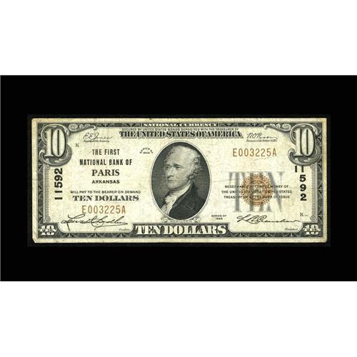 <B>Paris, AR</B></I> - $10 1929 Ty. 1 <B>The First NB</B></I> Ch. # 11592<BR>A pleasing evenly circulated example of this none too common note. <B>Fine-Very Fine.</B></I>