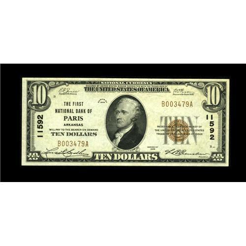 <B>Paris, AR</B></I> - $10 1929 Ty. 1 <B>The First NB</B></I> Ch. # 11592<BR>While this is not an especially rare bank, this piece is tied with one other as the highest grade note known from the bank. Bright <B>Extremely Fine+.</B></I><BR><BR><b>Shipping:</b> Coin/Currency (<a target="_blank" href="http://www.heritageauctions.com/common/shipping.php">view shipping information</a>)