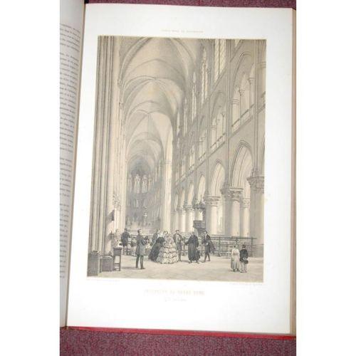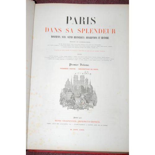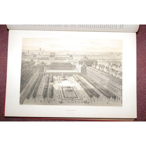 Paris Dans Sa Splendeur Monuments, Vues, Scenes Historiques, Descriptions et Histoire - 3 Volumes. Paris: Henri Charpentier, Elephant Folio - over 15" - 23" tall. Hard Cover. Ex-Library. Good Condition. Vol. 1 - 1863, Volumes 2 & 3 - 1861. Complete with 100 tinted lithographs (one being a Plan of Paris), text illustrations and title vignettes. Bound in half leather & cloth, raised bands on spines, marbled endpapers, bindings & hinges tight. Covers show worn corners and backstrip scuffing, interior foxing. Text in French. No obvious library markings on plates.