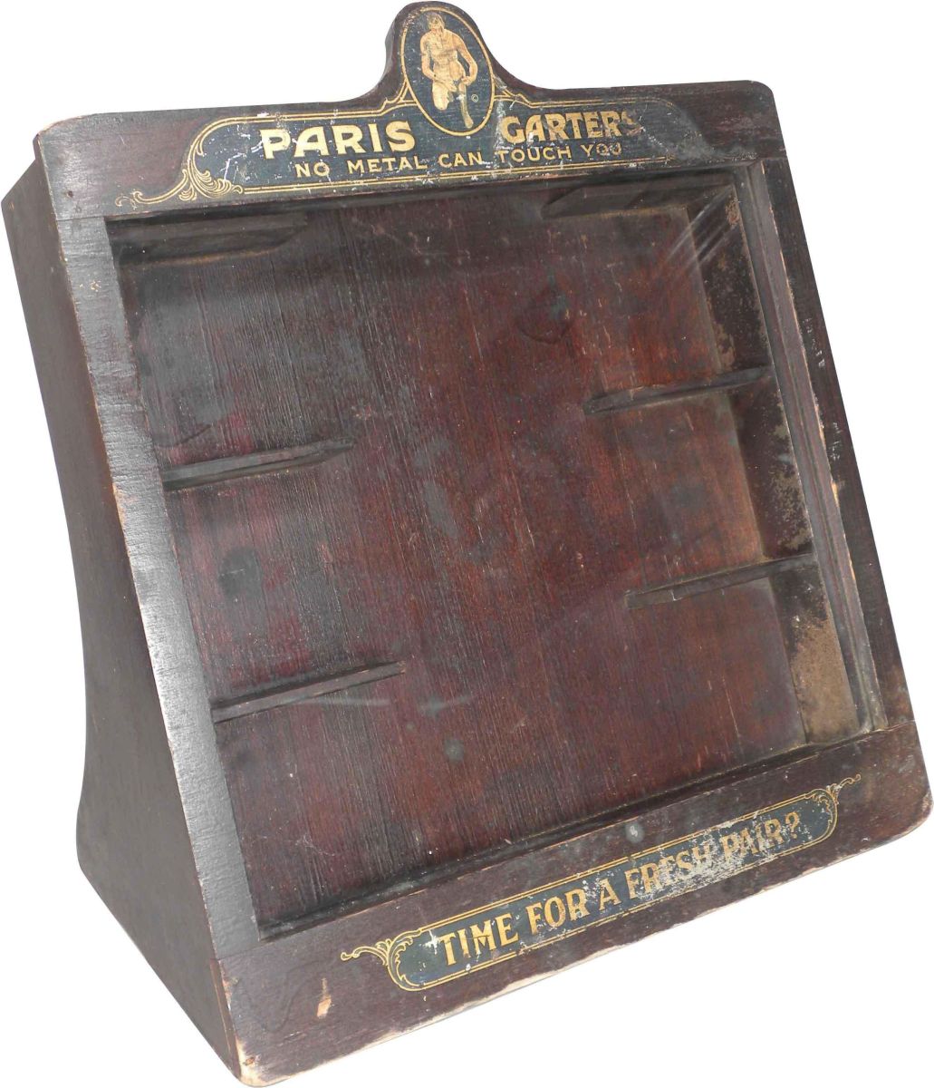 Paris Garter Store Display Cabinet. Wood and glass with original decals. Decals have wear and tear otherwise good condition. 16 X 17 X 8 1/2 inches.