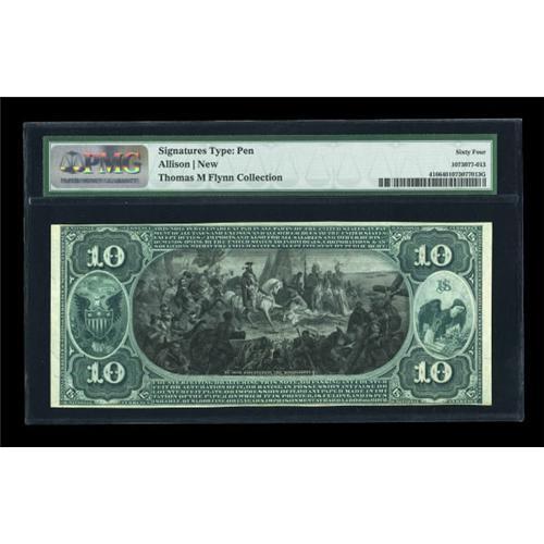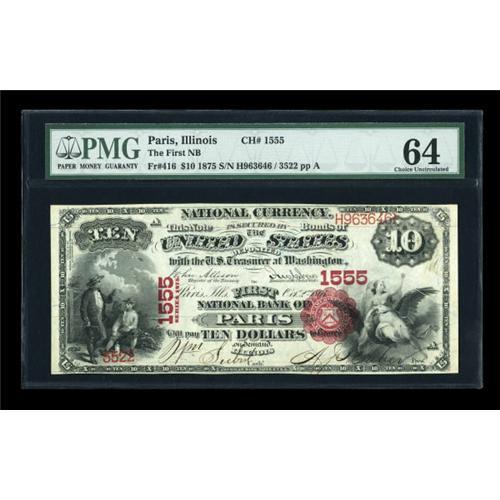 <B>Paris, IL</B></I> - $10 1875 Fr. 416 <B>The First NB</B></I> Ch. # 1555<BR> A bright and attractive example which is perfect for type. This comes from an old time hoard that dates back at least fifty years and has been the primary source for uncirculated Series 1875 tens ever since. Our consignor's notes indicate he paid a whopping $520 for this specimen in 1980, recalling a halcyon time before the real scarcity of items such as this was recognized. Bright PMG graded <B>Choice Uncirculated 64</B></I>, even nicer than the specimen from the Ameen collection that we sold in our January, 2007 sale for $7475.<BR><I>From The Thomas M. Flynn Collection</B></I><BR><BR><b>Shipping:</b> Coins & Currency (<a target="_blank" href="http://www.heritageauctions.com/common/shipping.php">view shipping information</a>)