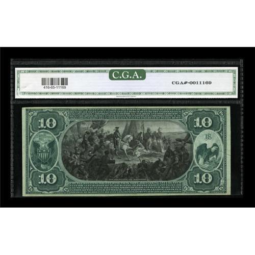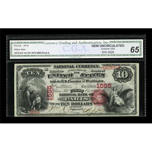 <B>Paris, IL</B></I> - $10 1875 Fr. 416 <B>The First NB</B></I> Ch. # 1555<BR> One of a small run of high end examples which has provided generations of collectors with the opportunity to obtain a high grade Series 1875 $10 or $20 note. This example has been graded by CGA as <B>Gem Uncirculated 65.</B></I><BR><BR><b>Shipping:</b> Coins & Currency (<a target="_blank" href="http://www.heritageauctions.com/common/shipping.php">view shipping information</a>)