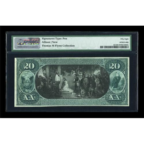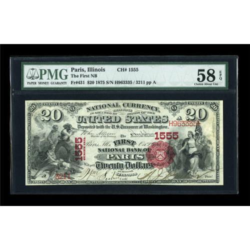 <B>Paris, IL</B></I> - $20 1875 Fr. 431 <B>The First NB</B></I> Ch. # 1555<BR> A simply gorgeous First Charter $20 with incredible color, paper quality, and originality. It comes from the small group of notes from this bank which has provided generations of collectors lovely $10 and $20 First Charter examples. This was one of Tom's early purchases, with its last public appearance coming in a 1974 Pine Tree sale, where it was graded Choice Uncirculated. In a more conservative era where grading services are applying very stringent standards, it has now been assigned a grade of <B>Choice About Uncirculated 58 EPQ,</B></I> but make no mistake, few FCP twenties will display the color and eye appeal evident here. <BR><I>From The Thomas M. Flynn Collection</B></I><BR><BR><b>Shipping:</b> Coins & Currency (<a target="_blank" href="http://www.heritageauctions.com/common/shipping.php">view shipping information</a>)