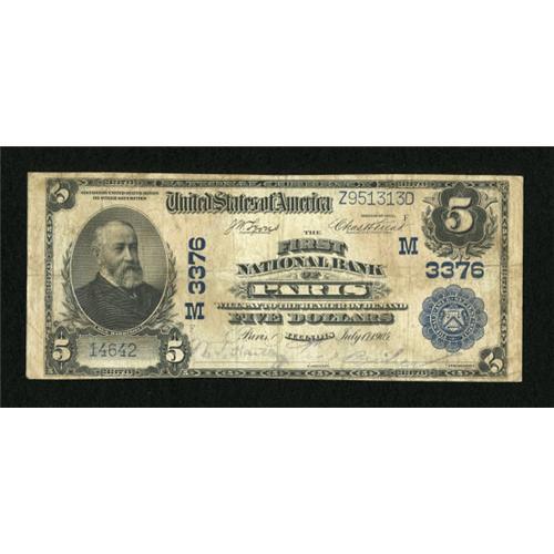 <B>Paris, IL</B></I> - $5 1902 Plain Back Fr. 599 <B>The First NB</B></I> Ch. # (M)3376<BR> The paper is very snappy on this <B>Fine </B></I>$5. Light signatures are of W.T. Hartley and A. Baber.<BR><BR><b>Shipping:</b> Coins & Currency (<a target="_blank" href="http://www.heritageauctions.com/common/shipping.php">view shipping information</a>)