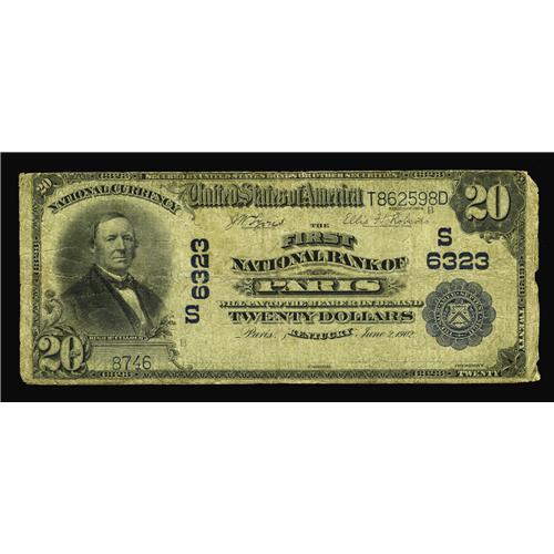 <B>Paris, KY</B></I> - $20 1902 Plain Back Fr. 650 <B>The First NB</B></I> Ch. # (S)6323<BR>The signatures have faded from this $20 that has a clipped upper right-hand corner tip. <B>Very Good.</B></I>
