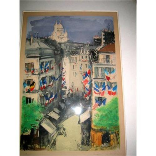 Signed wood engraving by Roger Bertin. Dated 1954 Is the view of the Libaration Day in Paris at the Sacre Coeur with a lot of French Flags on windows and also one American Flag. Number 13/125 Paris Rue du Faubourg Montmartre Hand colored Size: 25" X 35"