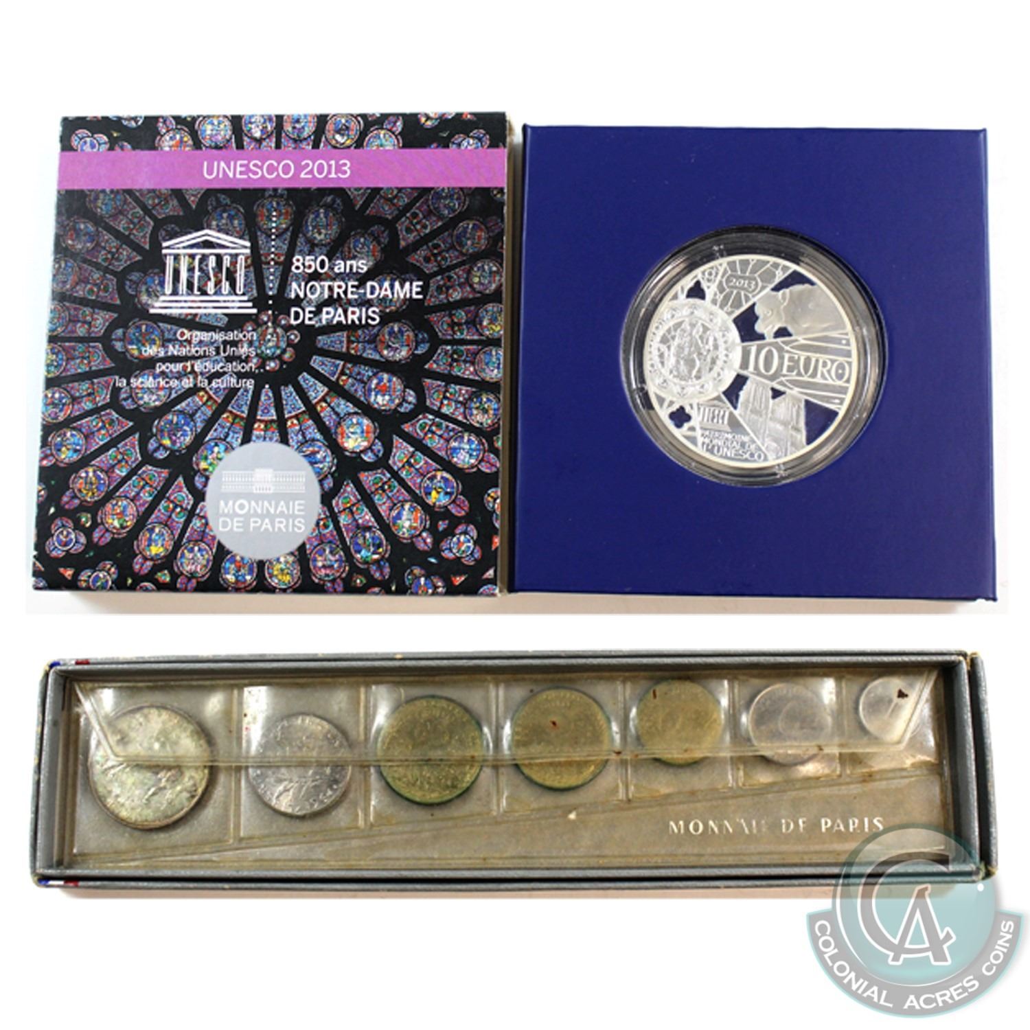 Paris Mint Issue: 1964 7-coin Mint Set & 2013 10 Euro 850th Anniversary of Notre-Dame Cathedral .900 Enameled Silver Coin (Mint set is impaired & the 2013 coin is lightly toned). 2pcs