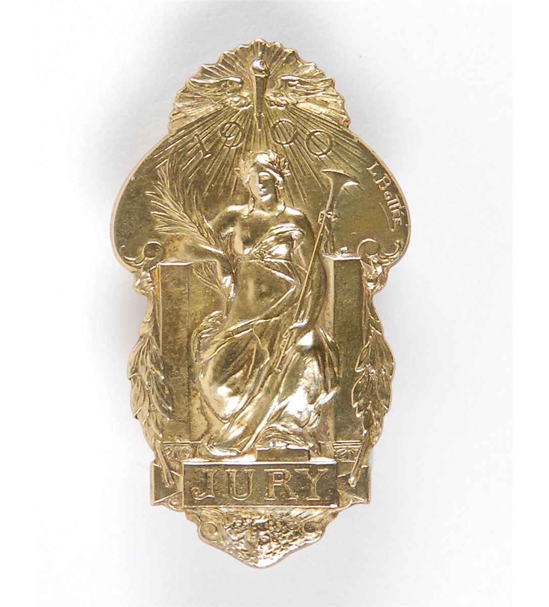 Original 1900 Paris Summer Olympics judge’s pin. Gold-plated silver pin, manufactured by Christofle, measures 23mm x 41mm, weighs approximately 10 grams, and has a ‘button-hole’ closure on the back. Front of the badge depicts Fame seated on a throne, a palm branch in her right hand and a trumpet in her left, with the artist’s name along the right edge, “1900” printed at the top, and “Jury,” at the bottom. Condition is very fine. These badges are recognized as the first metal Olympic Games participation badges.