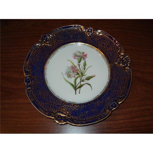 A Beautiful Soft Paste Porcelain Plate,Circa 1835, By Paris Porcelain, of Paris, France.  The Shaped "Bleu-du-Roy" border Decorated with Vermiculation in fine Gilt.  The Edge with Rocailles and the Center Reserves painted with Highly Detailed and Shaded Floral Specimens,  Very Similar to those found in the Catalogs of Pierre Joseph Redoute, of the time.  This Plate is in Excellent Condition, with no Breaks, chips or cracks.  Some slight rubbing to the interior Gilt work, in the expected areas of a piece this age.  The Back is Marked with an incised lower case "n" and the Characteristics prong indentations from the firring process. Please See my other Listings for Companion Plates.