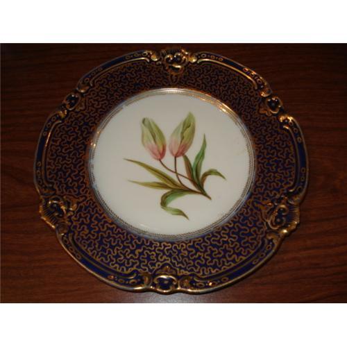 A Beautiful Soft Paste Porcelain Plate,Circa 1835, By Paris Porcelain, of Paris, France. The Shaped "Bleu-du-Roy" border Decorated with Vermiculation in fine Gilt. The Edge with Rocailles and the Center Reserves painted with Highly Detailed and Shaded Floral Specimens, Very Similar to those found in the Catalogs of Pierre Joseph Redoute, of the time. This Plate is in Excellent Condition, with no Breaks, chips or cracks. Some slight rubbing to the interior Gilt work, in the expected areas of a piece this age. The Back is Marked with an incised lower case "n" and the Characteristics prong indentations from the firring process. Please See my other Listings for Companion Plates.