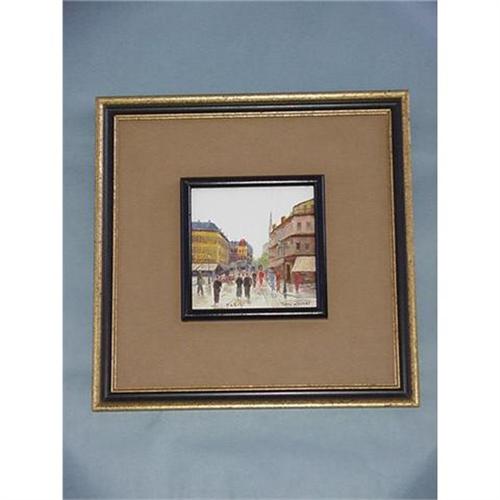 A framed tile, 6" square, framed size 14 1/2" Square. A Paris street scene hand painted and signed Teddy Wolfara. Probably done in the 1950's-60's