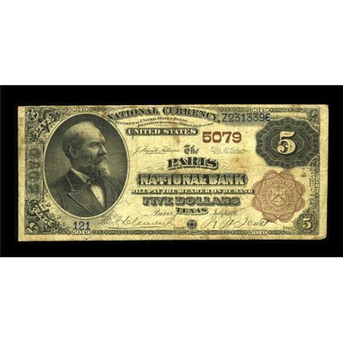 <B>Paris, TX</B></I> - $5 1882 Brown Back Fr. 475 <B>The Paris NB</B></I> Ch. # 5079<BR> Only four Brown Backs are available to collectors from this short-lived bank that was in business from 1897 to 1907, as one of the five known examples is in the Moody holdings. This <I>ex-Ivy Collection </B></I> note still has legible signatures and is mostly problem free. <B>Fine.</B></I><BR><BR><b>Shipping:</b> Coins & Currency (<a target="_blank" href="http://www.heritageauctions.com/common/shipping.php">view shipping information</a>)