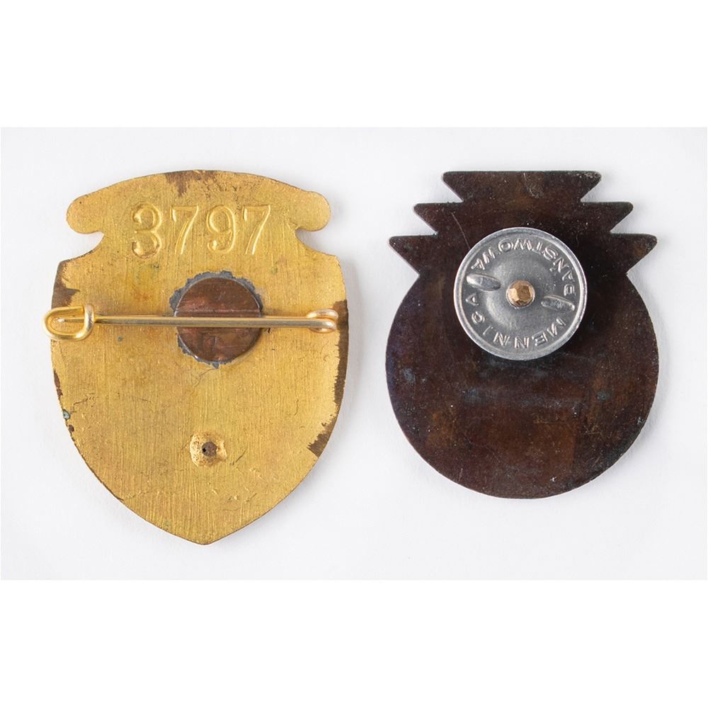 Pair of competitor badges issued for the Paris 1924 and Amsterdam 1928 Summer Olympics: the gold-tone shield-shaped Paris badge, 32 mm x 38 mm, features raised ‰ÛÏCOF‰Û text to center and a white enamel border, ‰ÛÏOfficiel, VIIIe Olympiad Paris 1924,‰Û with reverse stamped: ‰ÛÏ3797‰Û; and the bronze-tone Amsterdam badge, 32 mm x 38 mm, with raised rings and ‰ÛÏ1928, Concurrent‰Û to center, and upper red, white, and blue bars reading: ‰ÛÏIX3, Olympiade, Amsterdam.‰Û The Paris badge has a replaced backing. In overall fine condition.