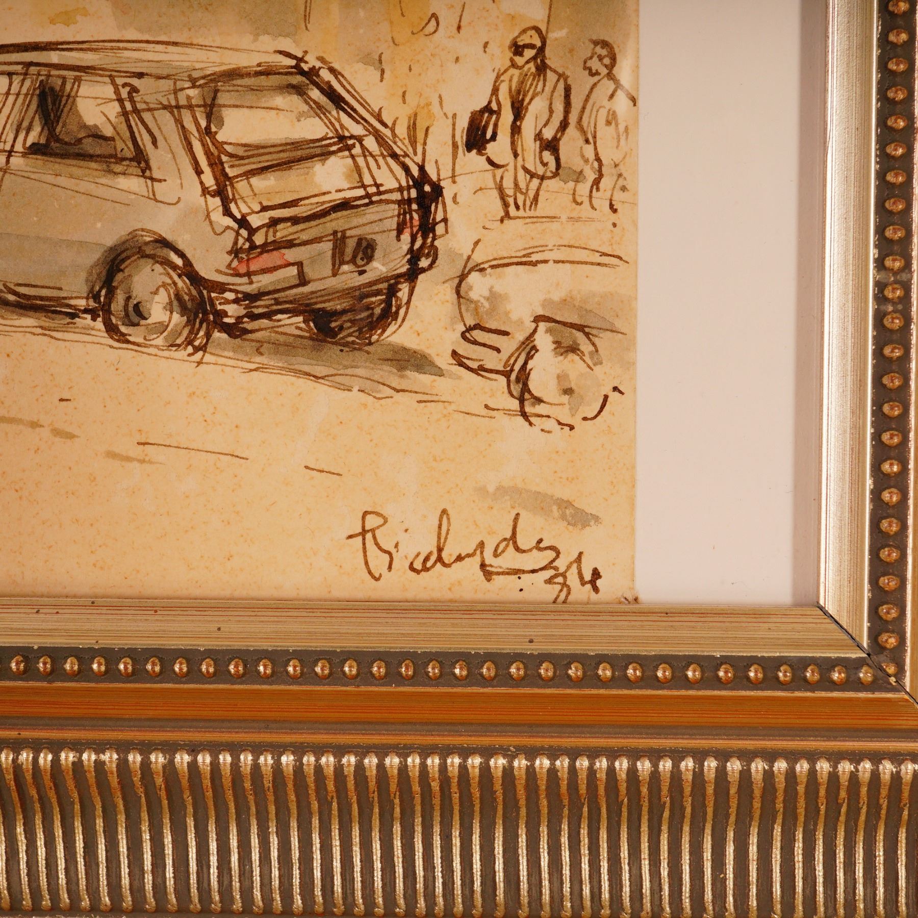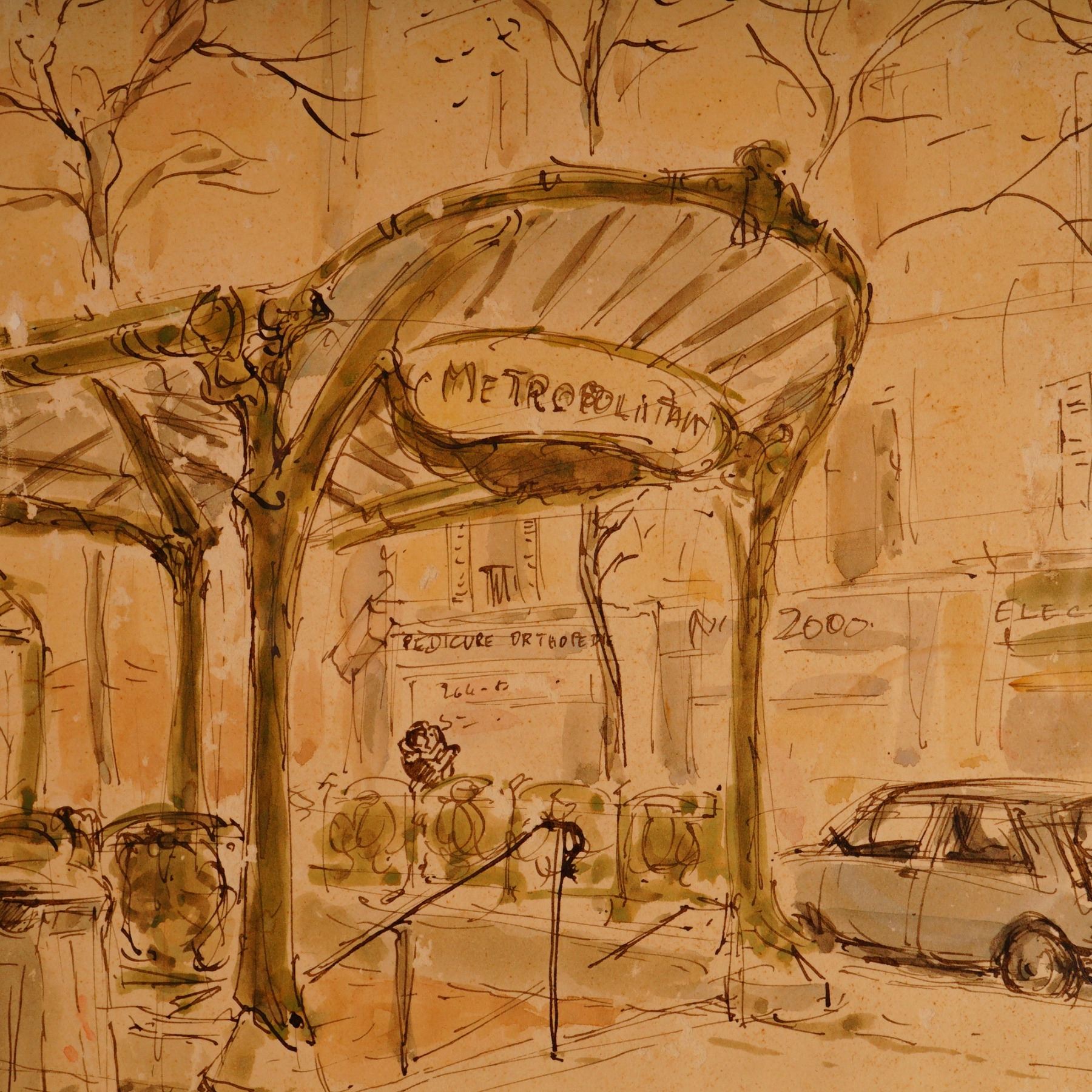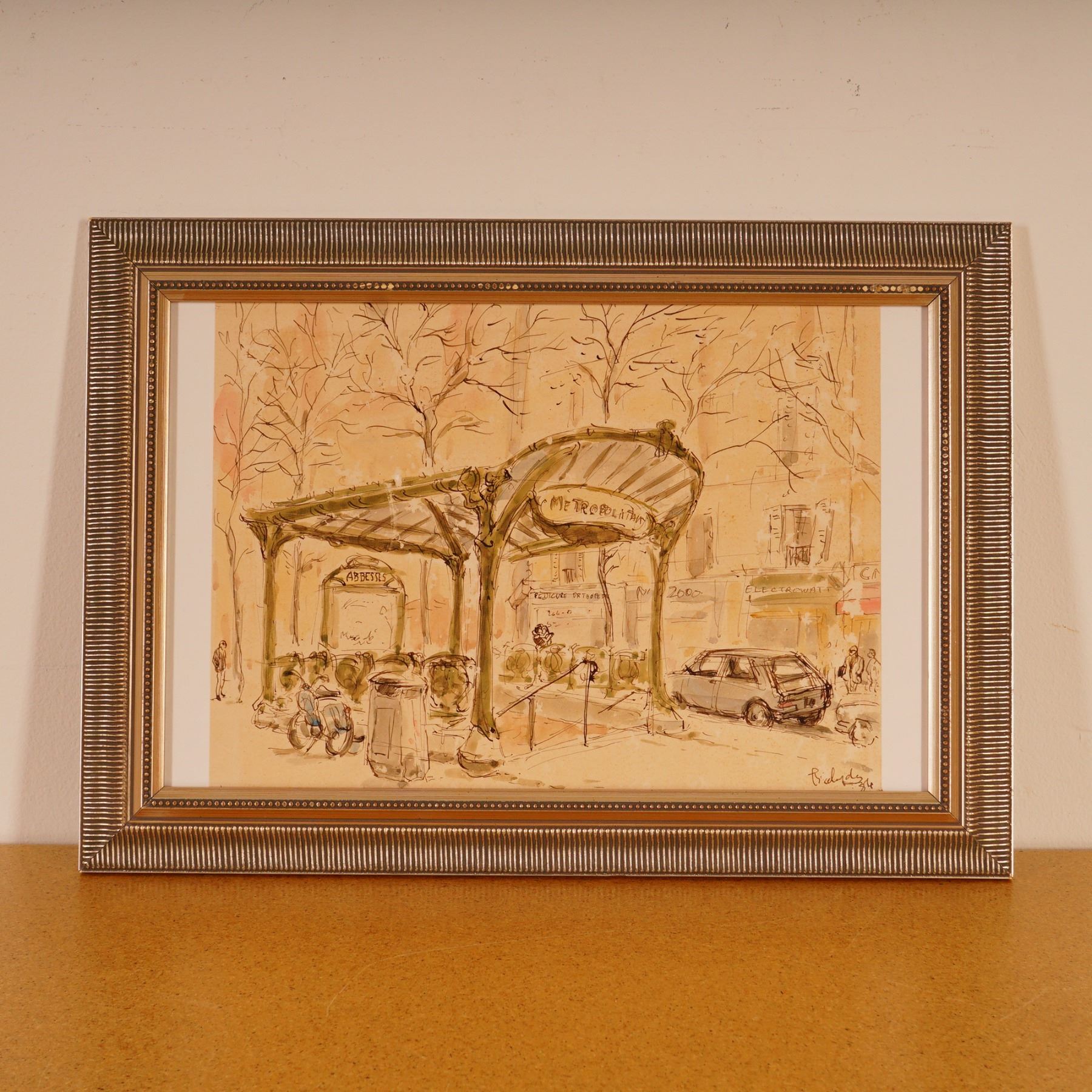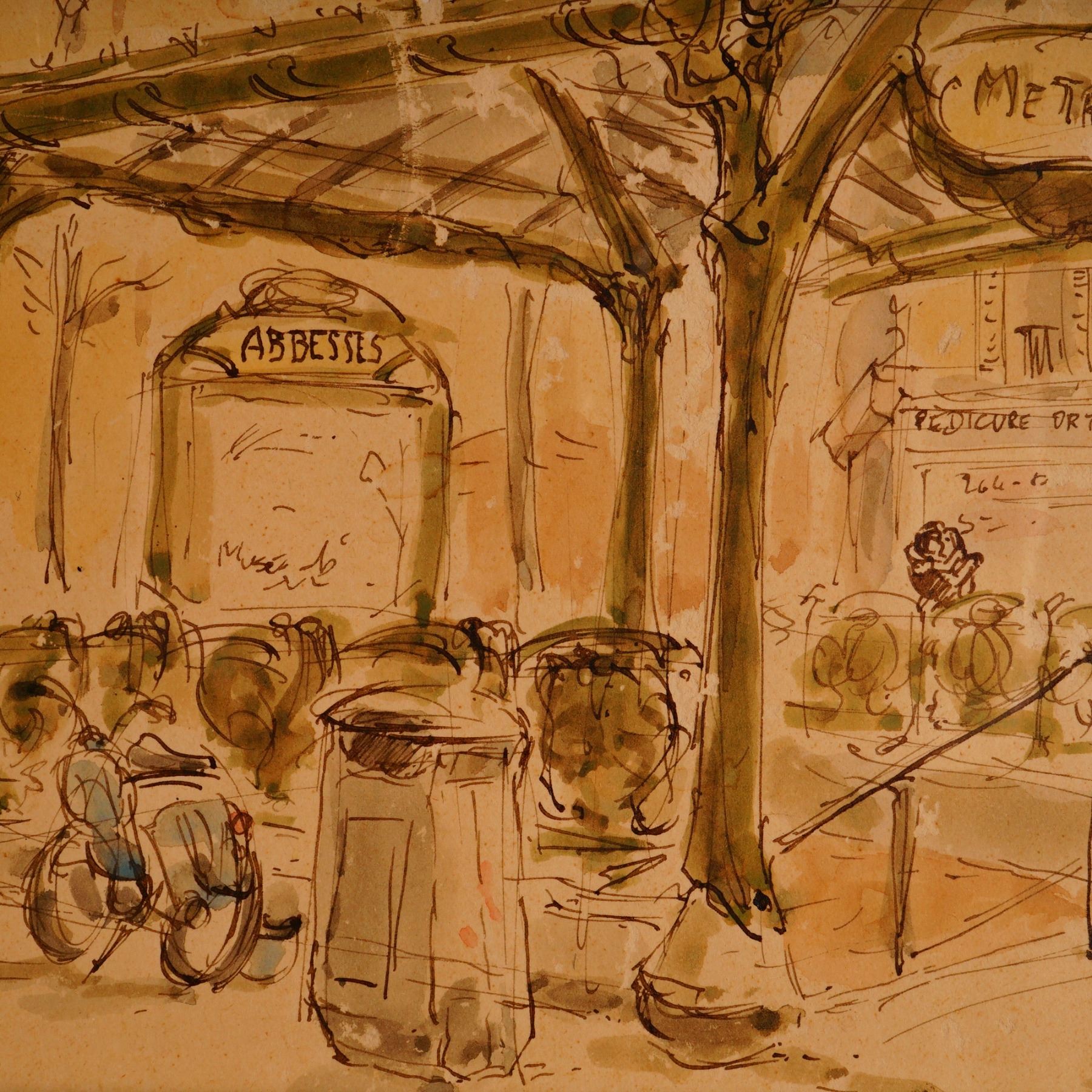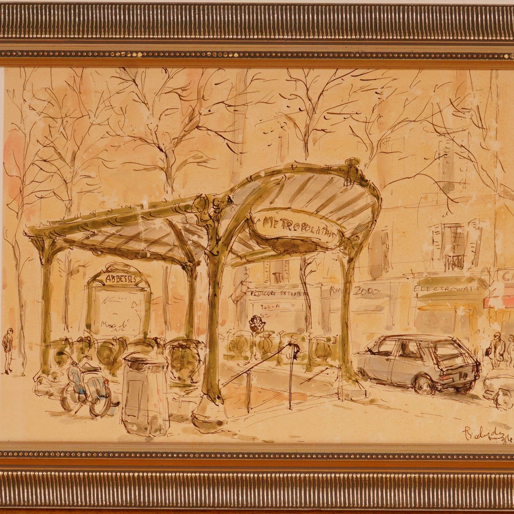 Charming watercolor and ink cityscape depicting the Abbesses Metro station entrance in Paris, France. The work captures the Art Nouveau-style canopy designed by Hector Guimard, rendered in warm sepia tones with delicate linework that conveys the lively street atmosphere of Montmartre. Figures, vehicles, and architectural details are sketched with expressive spontaneity. Signed and dated lower right. Professionally framed under glass with a metallic ribbed frame and mat, with a White Glove framing label verso from Aaron Brothers.