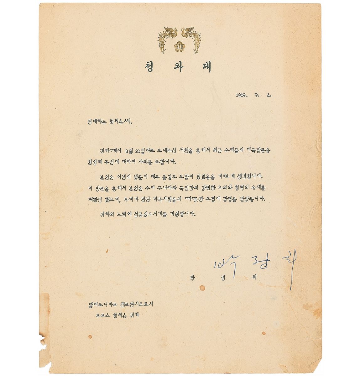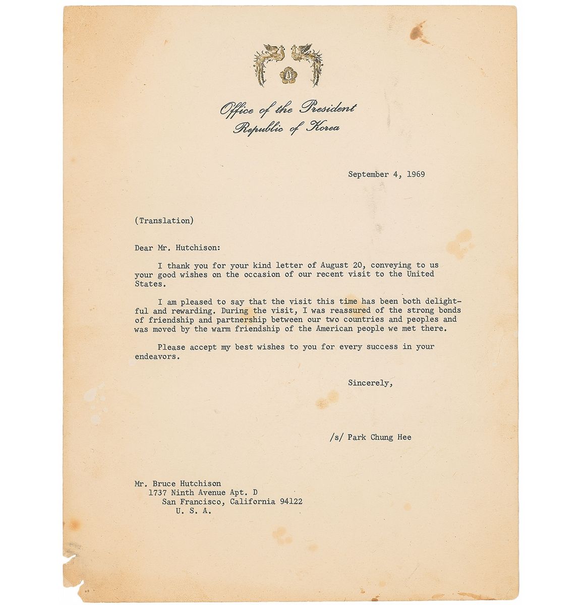 South Korean military leader (1917–1979) who seized power in a 1961 coup d’etat; he was assassinated by the director of his own security force. TLS in Korean, one page, 8.25 x 11, embossed Office of the President of the Republic of Korea letterhead, September 4, 1969. Response to a letter conveying good wishes on the occasion of his recent visit to the United States. In part (translated): “I am pleased to say that the visit this time has been both delightful and rewarding. During the visit, I was reassured of the strong bonds of friendship and partnership between our two countries and peoples and was moved by the warm friendship of the American people we met there.” In very good condition, with moderate scattered creases, toning, and soiling, and a bit of paper loss to one corner. Accompanied by an English translation on the same official letterhead.