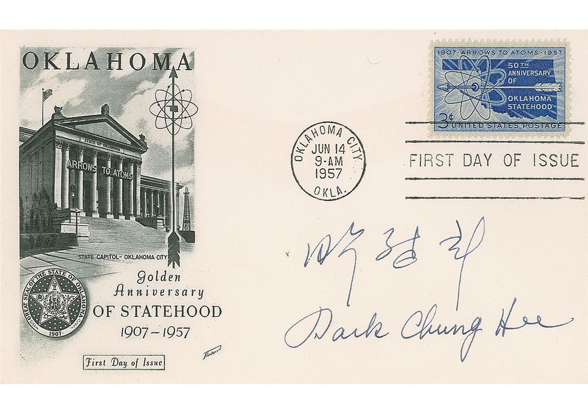 South Korean military leader (1917–1979) who seized power in a 1961 coup d’etat; he was assassinated by the director of his own security force. FDC with a cachet honoring the 50th anniversary of Oklahoma’s statehood, signed in black ink in English and in Korean characters. In fine condition.