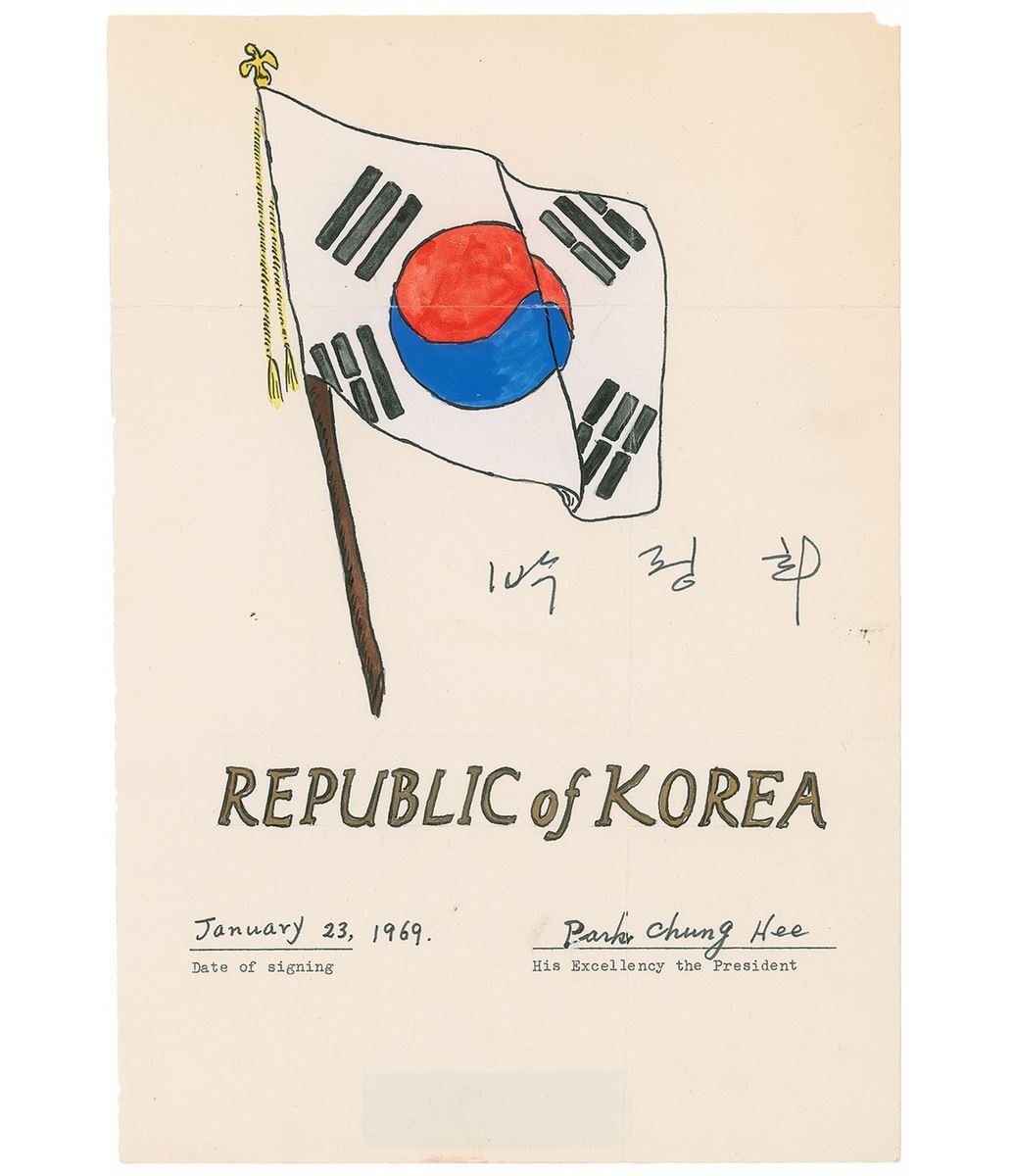 South Korean military leader (1917–1979) who seized power in a 1961 coup d’etat; he was assassinated by the director of his own security force. An interesting drawing of the Korean flag by an unknown amateur artist, 7.5 x 11, signed below the depiction of the flag in black ink in Korean characters, and signed again and dated at the conclusion, “Park Chung Hee, January 23, 1969.” Intersecting folds (one vertical fold passing through a single letter of the signature), otherwise fine condition. Accompanied by an unsigned photo.