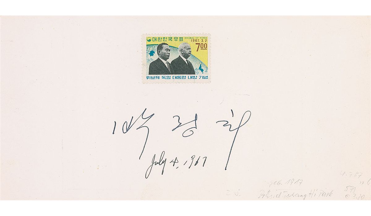 South Korean military leader (1917–1979) who seized power in a 1961 coup d’etat; he was assassinated by the director of his own security force. Fountain pen signature of Park Chung-hee on an off-white 8 x 4 card bearing an affixed postage stamp, dated July 4, 1967. Removably matted in corner mounts with a portrait to an overall size of 8.25 x 11.75. In fine condition. Park Chung-hee was elected as president of South Korea in 1963 as the candidate of the newly created Democratic Republican Party, narrowly defeating the incumbent Yun Bo-seon. He was easily re-elected on May 3, 1967, just two months before signing this autograph.