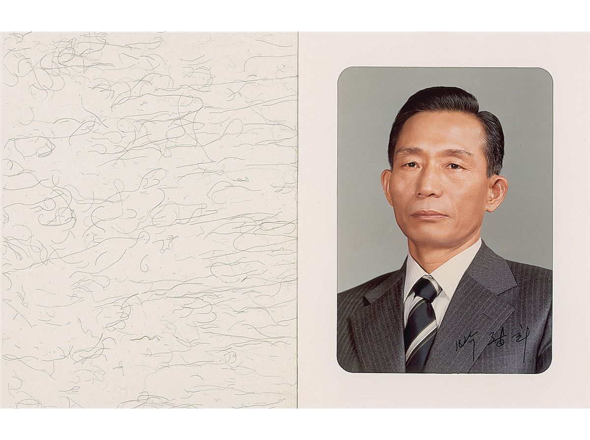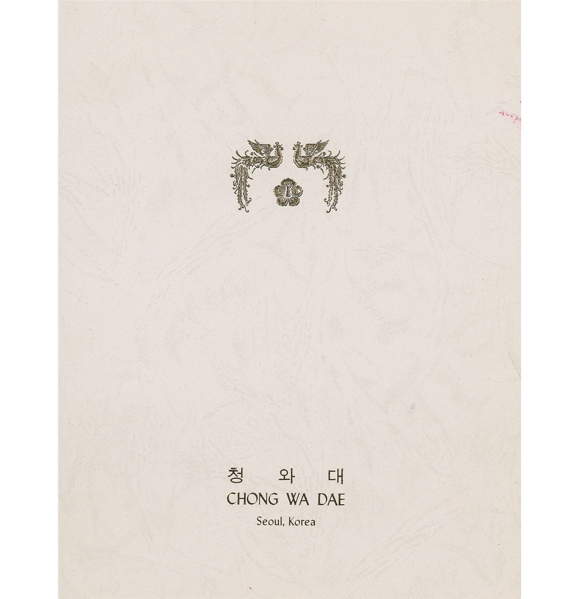 South Korean military leader (1917–1979) who seized power in a 1961 coup d’etat; he was assassinated by the director of his own security force. Rare color satin-finish 5.25 x 7.5 photo of Park Chung-hee in a handsome formal pose, signed in black ink. Displayed in its original 7.25 x 9.25 presentation folder. In fine condition. An extremely scarce portrait of the notorious Korean leader, including the highly desirable gilt-embossed presentation folder.