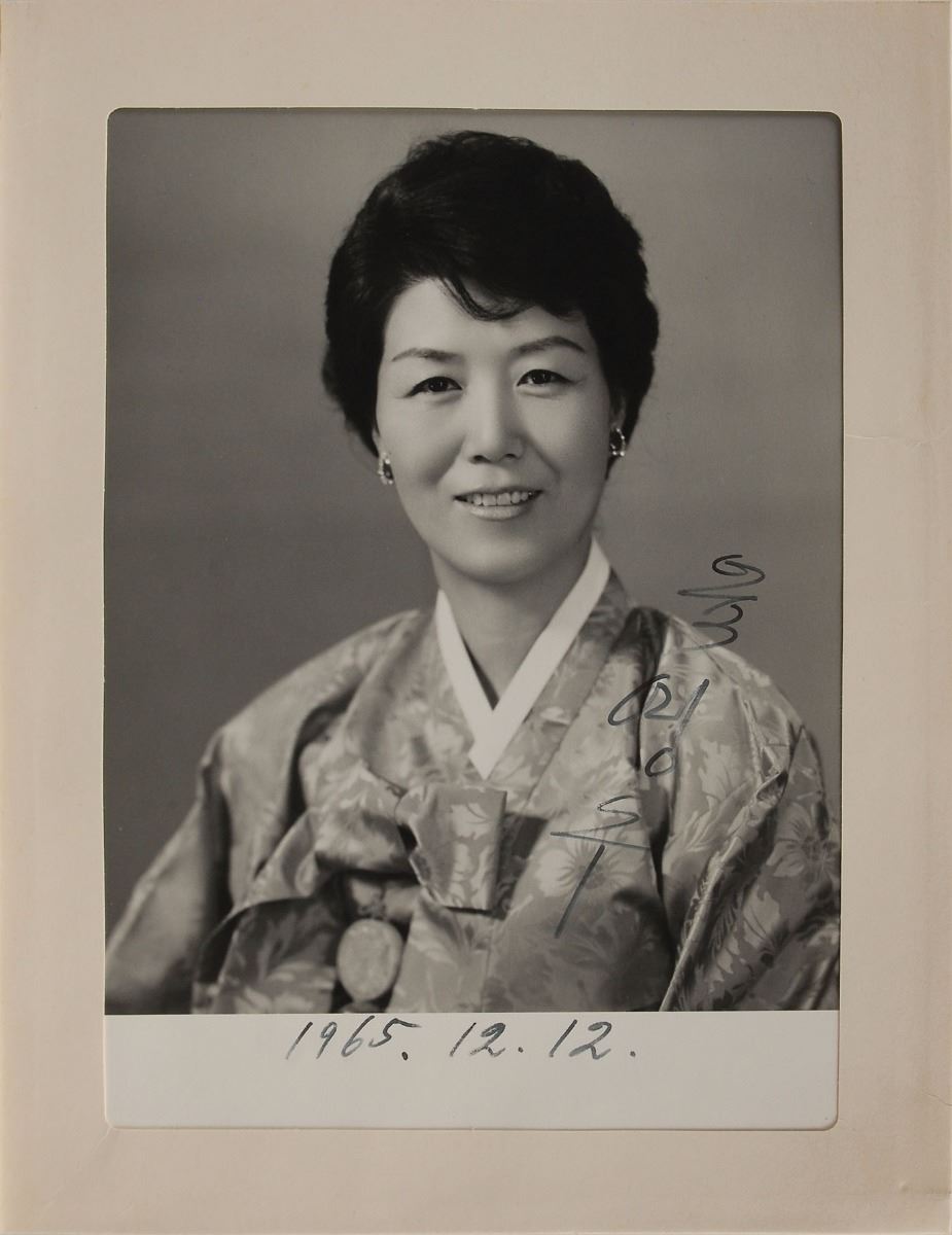 Extremely desirable pair of signed photos: a matte-finish 8 x 11 formal portrait of Park Chung-hee, signed in Korean in black ink and dated in another hand, November 11, 1965, held in its original 10 x 13 presentation folder; and a matte-finish 7 x 9.75 portrait of his wife Yuk Young-soo, signed in Korean in black ink and dared December 12, 1965, also in its original presentation folder. In fine condition, with light dampstaining to the Park Chung-hee presentation folder not affecting the photos.
