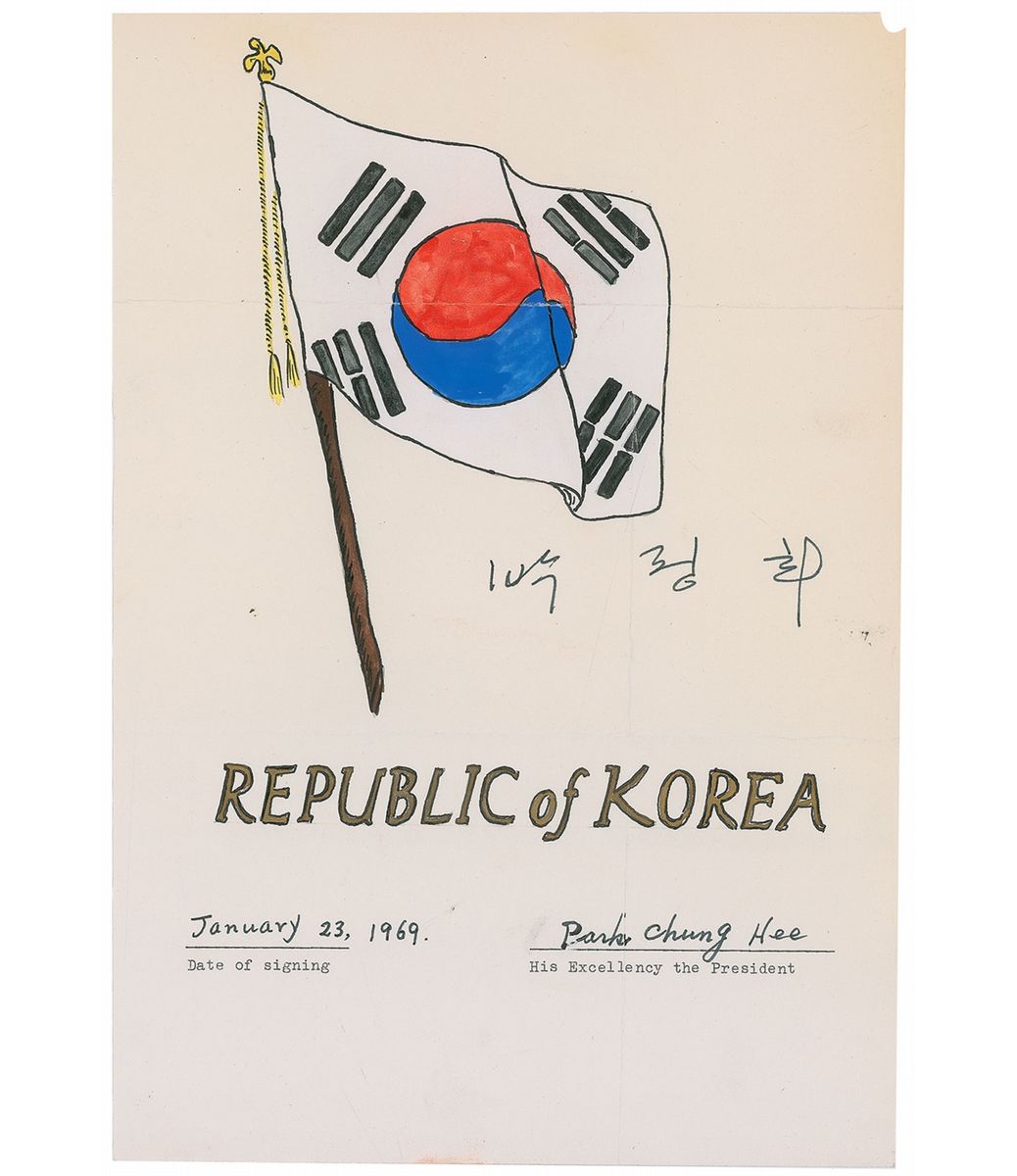 South Korean military leader (1917–1979) who seized power in a 1961 coup d’etat; he was assassinated by the director of his own security force. An interesting drawing of the Korean flag by an unknown amateur artist, 7.5 x 11, signed below the depiction of the flag in black ink in Korean characters, and signed again and dated at the conclusion, “Park Chung Hee, January 23, 1969.” Intersecting folds (one vertical fold passing through a single letter of the signature), otherwise fine condition.