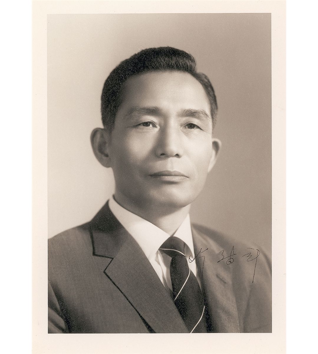 South Korean military leader (1917–1979) who seized power in a 1961 coup d’etat; he was assassinated by the director of his own security force. Scarce matte-finish 6.25 x 8.75 portrait of Park Chung-hee in a handsome formal pose, signed in black ink in Korean characters. In fine condition, with slight irregular ink adhesion. Accompanied by a letter of transmittal from his secretary, dated 1972.