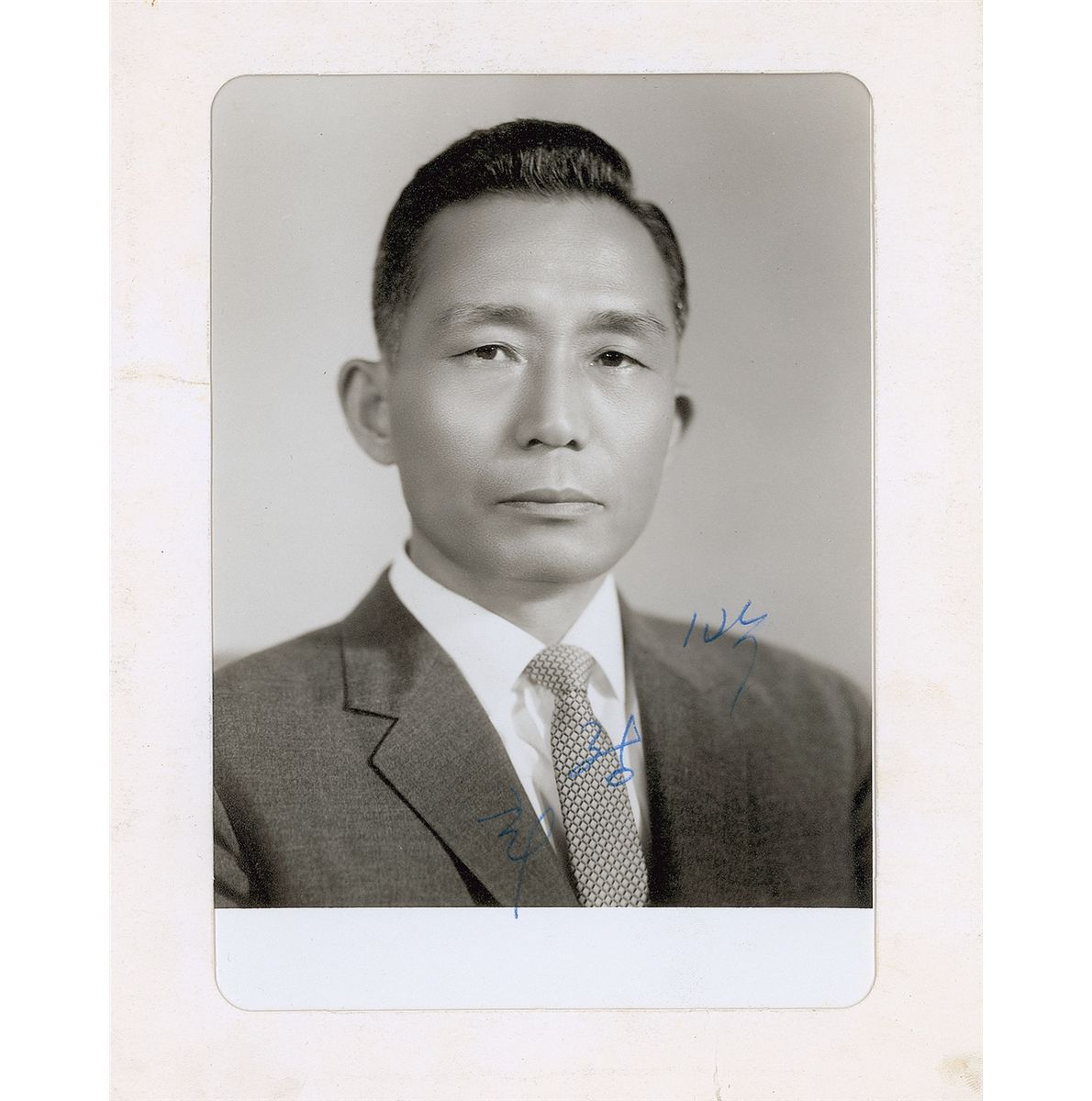South Korean military leader (1917–1979) who seized power in a 1961 coup d’etat; he was assassinated by the director of his own security force. Vintage matte-finish 5.5 x 7.75 portrait of Park Chung-hee in a dignified formal pose, signed in blue ink in Korean characters. Housed in its original presentation folder. In fine condition.