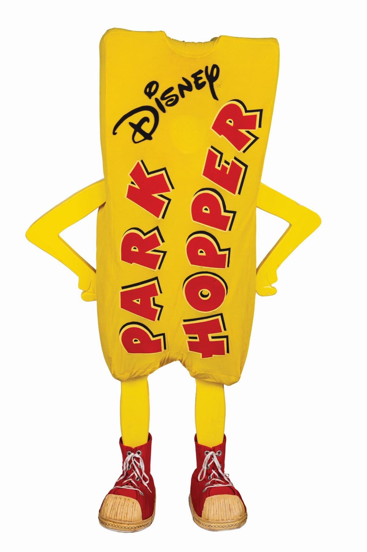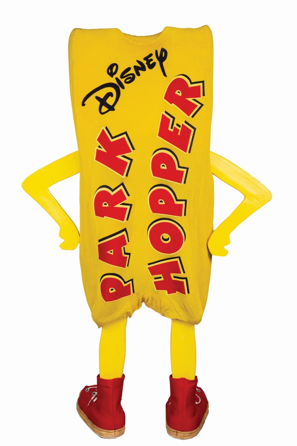 (Walt Disney World, 1990s) An extremely rare Disney Park Hopper costume used in the Disney Park Hopper promotion at Disney Parks. The Disney Park Hopper program was developed to allow guests to experience more Disney Parks during their vacations. The costume includes a foam yellow Park Hopper "suit", two shoes, two legs, two arms, and a rectangular center armature for connecting it all for display. The costume was heavily used during the promotion and shows a lot of wear, dirt, scuffs and creases from use. Some of the interior foam has deteriorated because of age. Overall, the unusual costume still displays well.