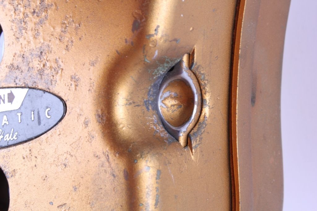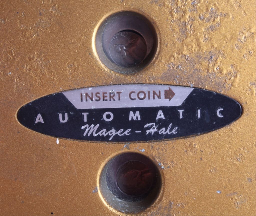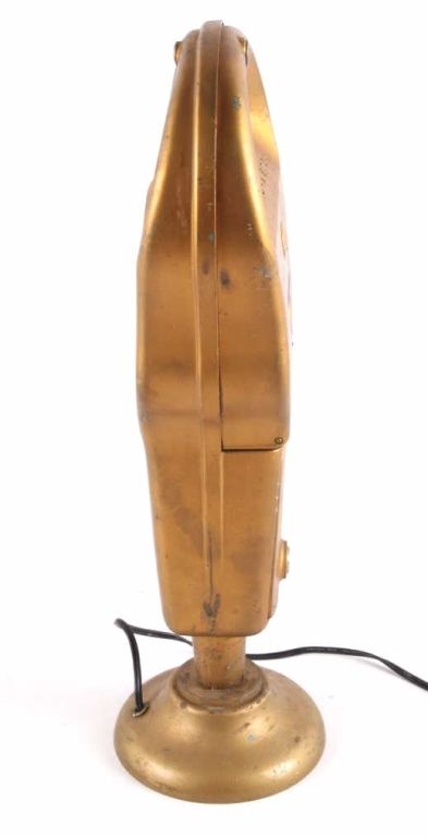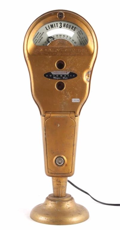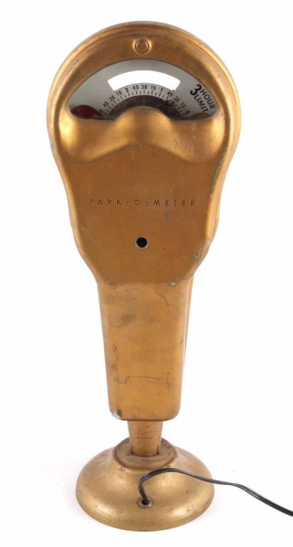This is made by Magee-Hale Park-O-Meter Company and is an old rare metal marking meter made into a lamp. The piece has a lighted face and shows a gold coloring with original cut down base. This piece takes nickels, dimes, and quarters and has a classic look. Measures 21" t x 7.75"w x 6.25"d This comes with the original key.