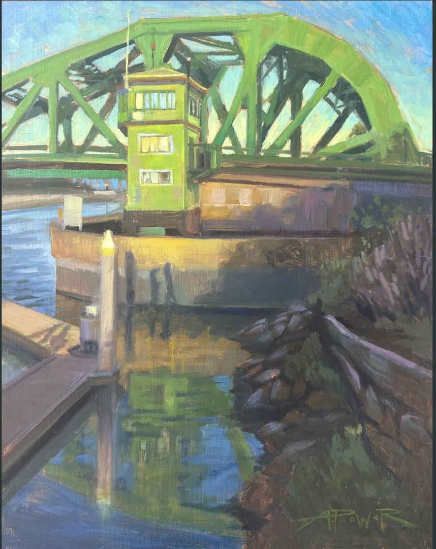A painting of the historic Alameda Park Street Bridge by Anette Power. This is a 16x20 oil on canvas panel, with artist's COA