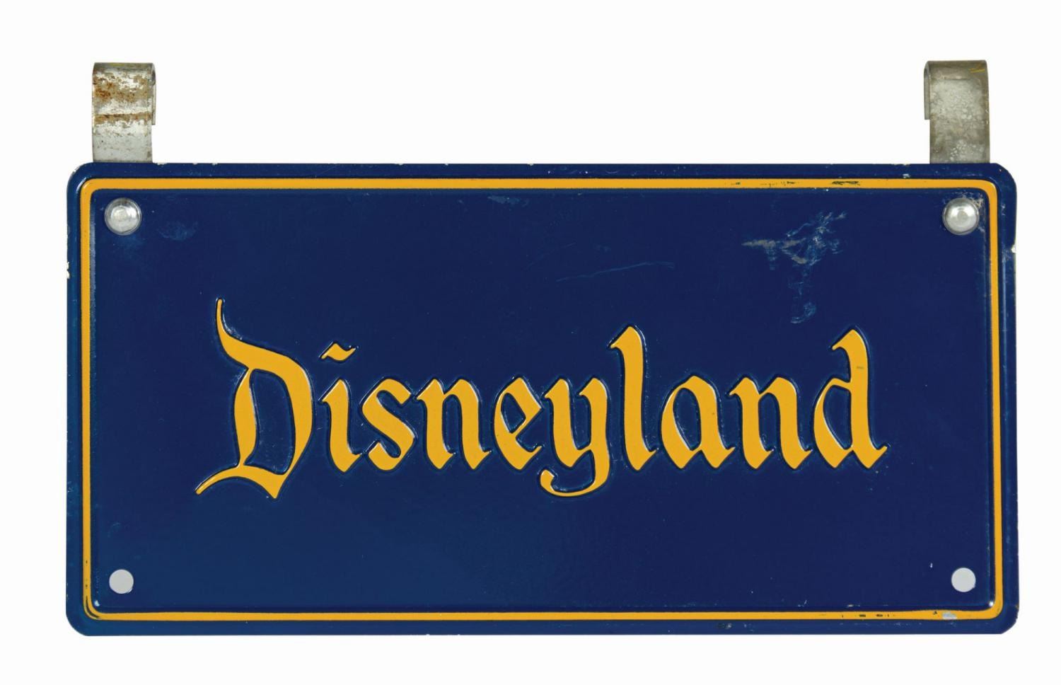 (Disneyland, c.1970) A rare license plate from Disneyland. These license plates were produced in thin metal and painted in blue and gold with "Disneyland" in raised letters. These plates could be seen on the back of the park's rented strollers and mimicked the popular blue and gold California vehicle plates that debuted in 1969. Measuring 4"x8", not including the hooks, the plate is in good condition with some surface scuffing and scratching from park use, and a bend to the metal at the upper right.