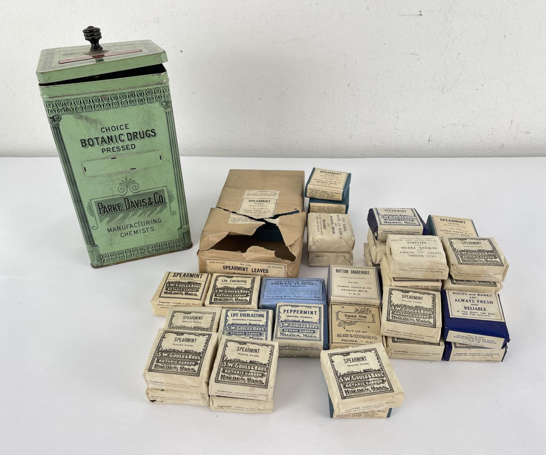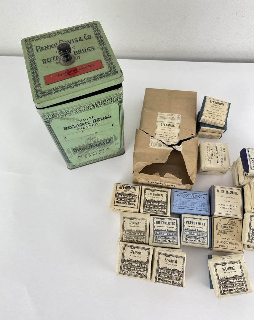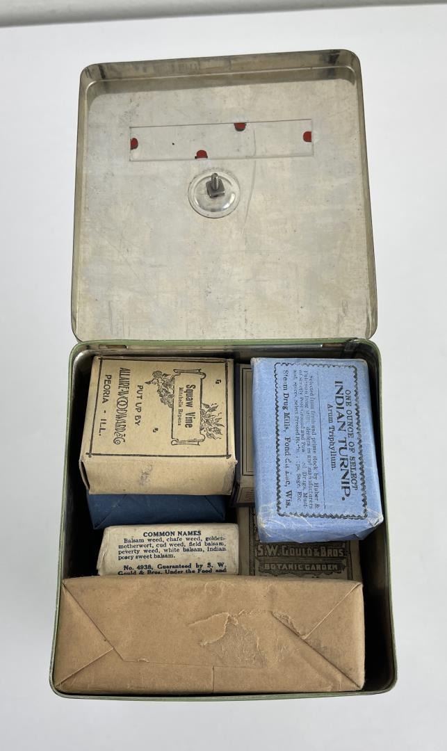 Very nice old druggists tin. Complete with contents. Contents are made by various manufacturers. Gould: Spearmint, Peppermint, Life Everlasting. Parke Davis: Button Snakeroot, etc.