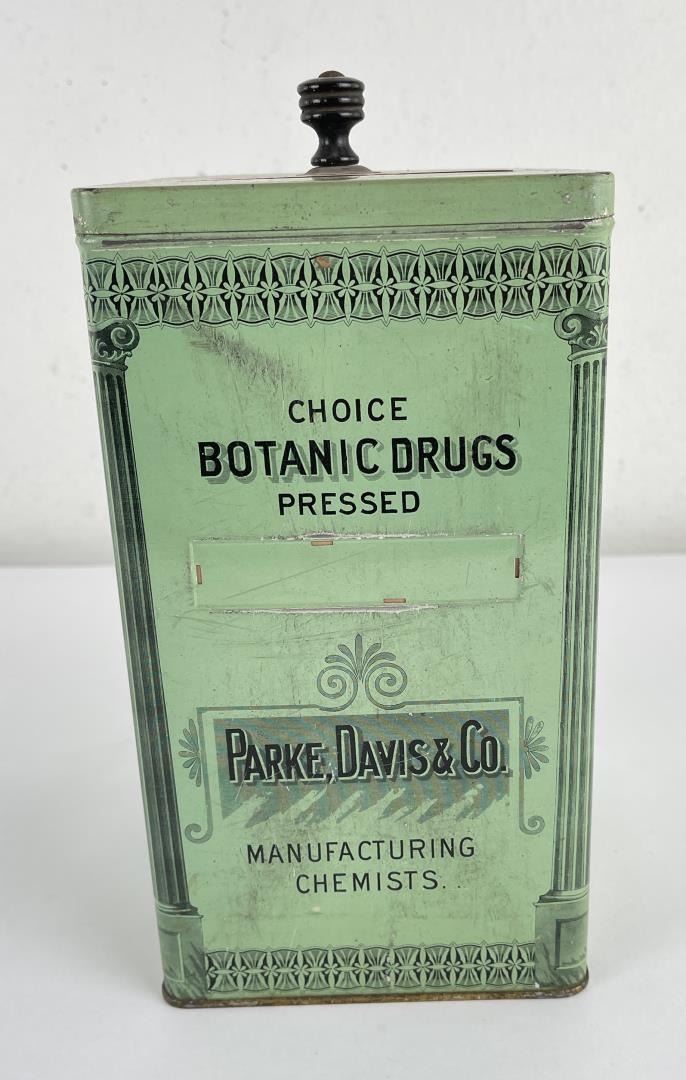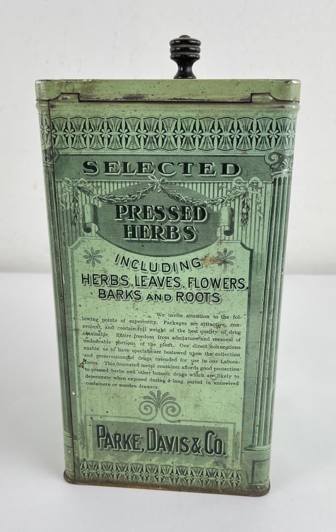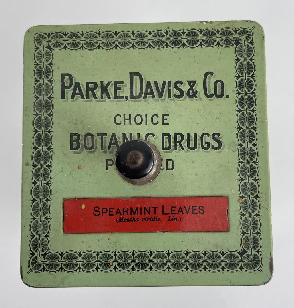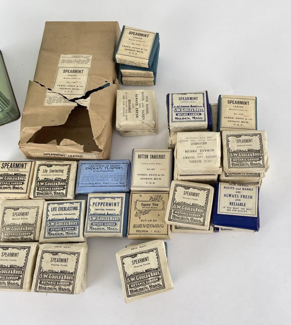 Very nice old druggists tin. Complete with contents. Contents are made by various manufacturers. Gould: Spearmint, Peppermint, Life Everlasting. Parke Davis: Button Snakeroot, etc.