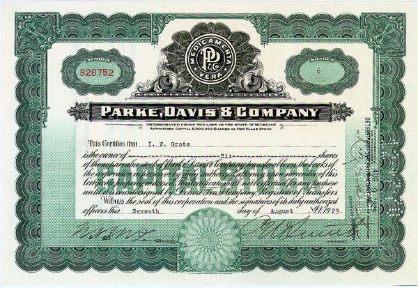 1936, Michigan. Stock certificate for 6 share. Green/Black. Engraved vignette of the company logo at top center A scarce early certificate of this well-known Pharmaceutical company. Lightly punch cancelled and excellent