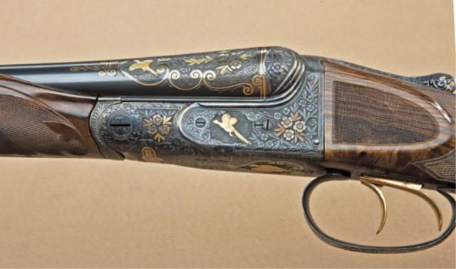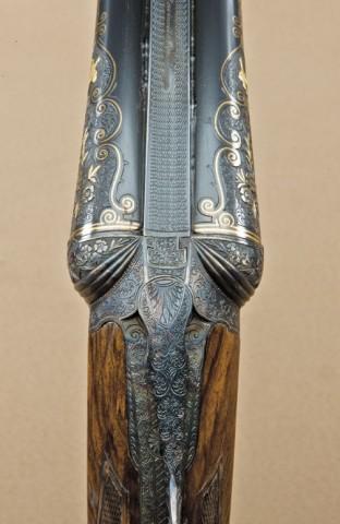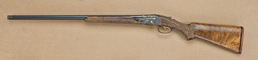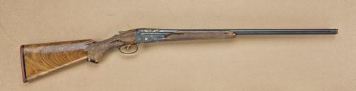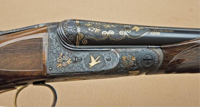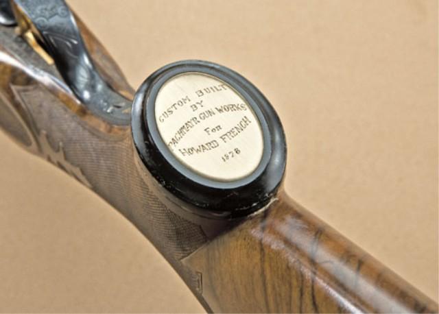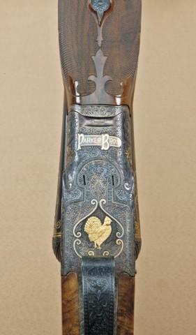 Parker 16ga side by side shotgun, upgraded by Pachmayr gunworks to Invincible Grade. 28” barrels, choked Modified (right) and Improved Modified (left). The gun shows double triggers, standard extractors, beavertail forend. The barrels and action are high relief engraved and gold inlaid with pierced lever and fancy checkered select walnut stocks with finest quality fancy checkering.. The design and style of upgrade is inspired by Parker Invincible, and the rib is marked Invincible by Pachmayr. The pistol grip cap is inlaid in gold and is inscribed “Custom Built by Pachmayr Gunworks for Howard French, 1978”. Howard French was Guns & Ammo’s well-known editor and one of Southern California’s most well known experts and collectors. The stock measures 15” to the end of the wood, 15-1/2” to the end of the pad. The engraving and gold inlay are very high quality. The left barrel shows a small split and some damage and should be attended to before firing. Also the rib has been poorly repaired. Otherwise the condition is near fine, the wood near excellent. Est: $8,000 - $12,000
