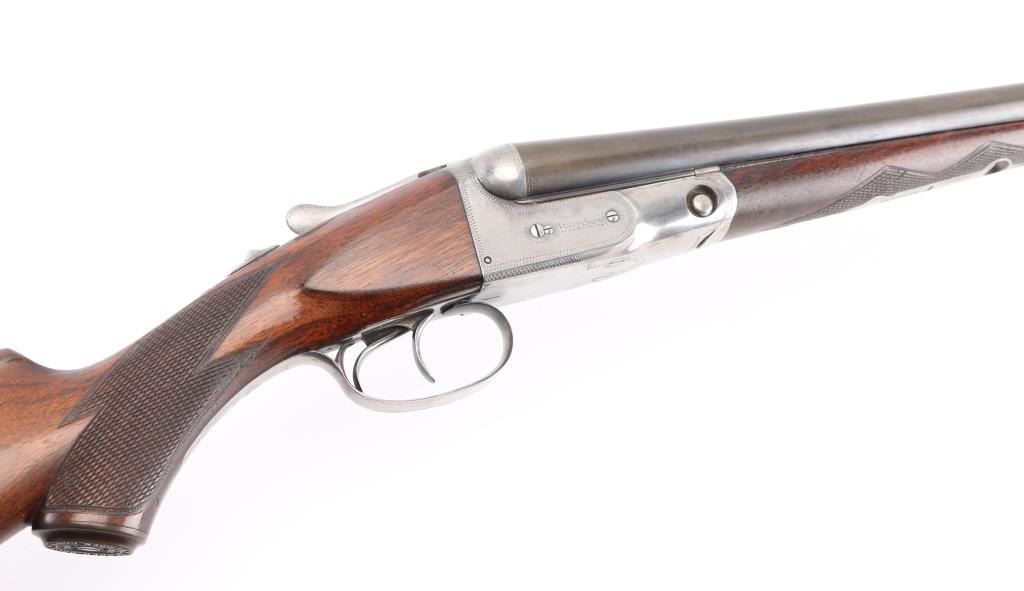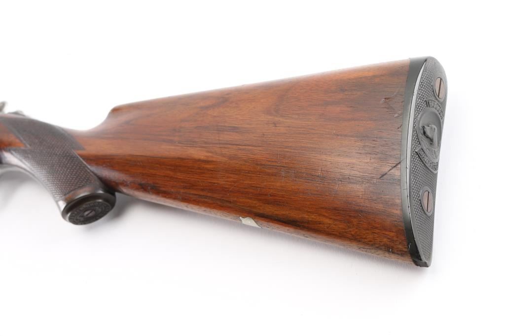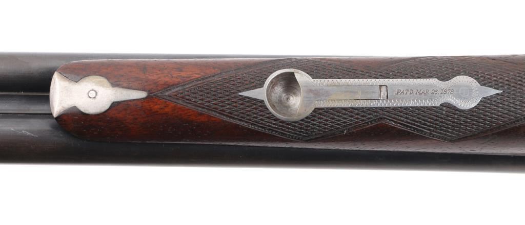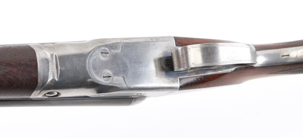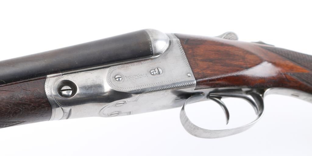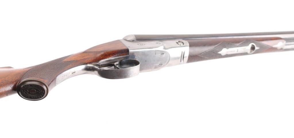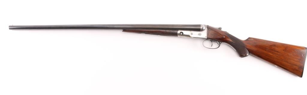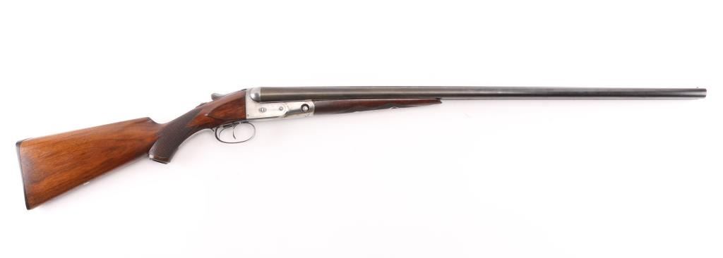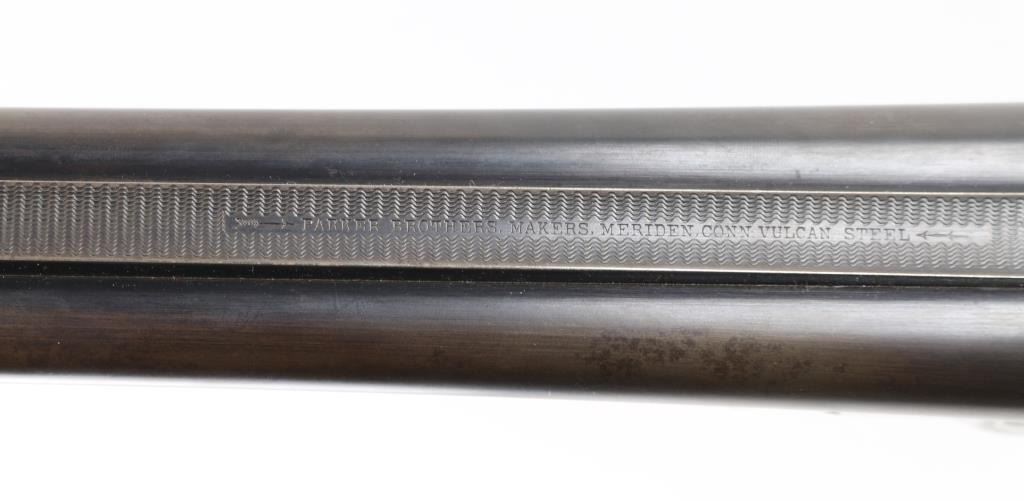 Vintage high quality side-by-side double barrel boxlock shotgun chambered for 2 3/4" 20 gauge shells, manufactured circa 1910. Features a blued & case hardened finish, Vulcan steel 28" barrels with solid concave matted rib, choked 20 Full/IM, extractor, bead front sight, zig-zag border engraved frame, with "Parker Bros" on each side. Double triggers, sliding tang safety, knurled top lever, checkered walnut splinter forend with patent date on the release latch, and checkered semi-pistol grip shoulder stock with factory grip cap, inlayed shield escutcheon, factory buttplate with dog & 14.25" LOP to forward trigger, 1-5/8" drop at heel, 3" drop at comb. Barrels retains approximately 75% bluing showing muzzle wear with handling wear, thinning. The receiver is in the white. Action is sound, the bores are mirror bright, barrel markings are sharp and the wood stocks are very good/sound with minor scratches/dings. Bores are excellent/bright. NRA Condition-Very Good. C&R Firearm.