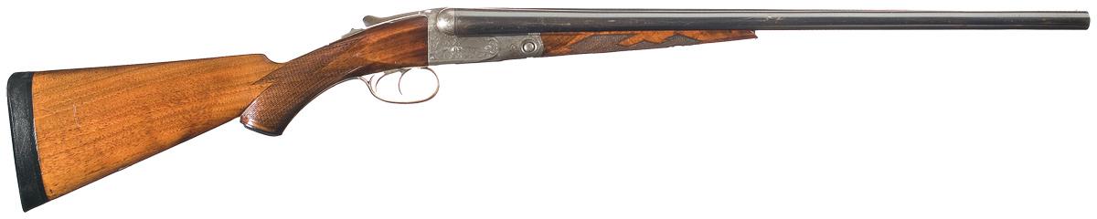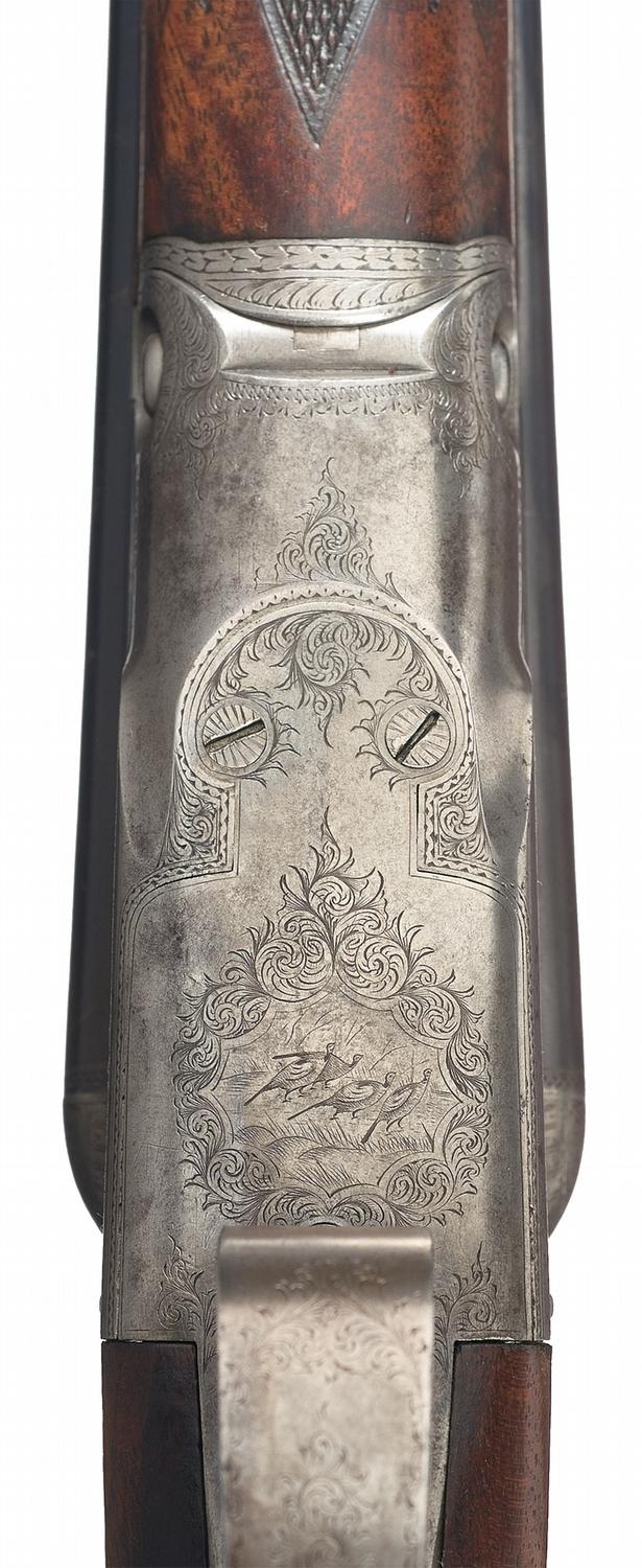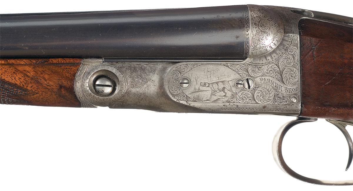This shotgun features an ivory bead front sight with ivory mid bead on the matte concave solid rib, 2 3/4" chambers, chokes on the shortened 23 1/2 inch barrels gauge at cylinder/cylinder with ejectors. The barrel rib is marked "PARKER BROS. MAKERS, MERIDEN CONN. TITANIC STEEL". The frame features a scroll engraving, dogs on point and "PARKER BROS" in a banner on each side and game birds on the underside. The scrollwork extends to the trigger guard, forearm hardware and break lever. Double triggers and tang safety. The gun is mounted with a multi point checkered splinter forearm and pistol grip stock with an Old English recoil pad. Length of pull is 14 1/8".