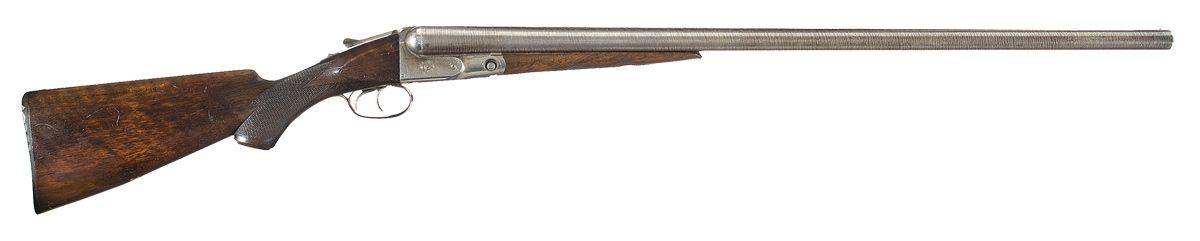 Made in 1902. Damascus Twist 4-3 weight barrels, brass bead sight, full chokes. Size 2 frame with P grade engraving. Checkered pistol grip figured stock with initial shield, Parker grip cap and buttplate. Length of pull approximately 14 1/8".
