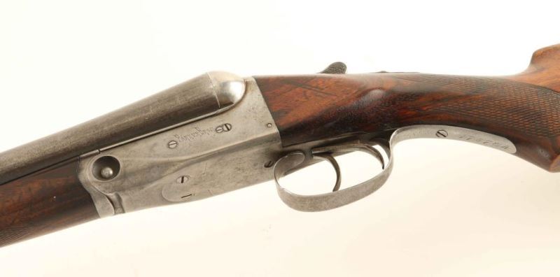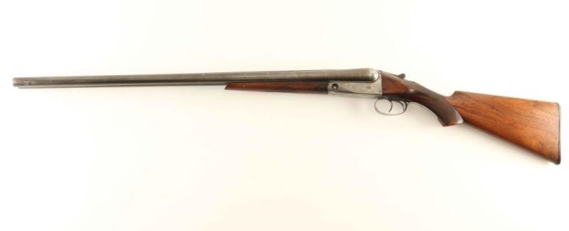 Vintage high quality side-by-side double barrel shotgun chambered for 2 3/4" 12 gauge shells, circa 1918. Features blued 28" Trojan steel barrels with matted concave rib, extractors, silver bead front sight, case hardened #2 frame, double triggers, sliding tang safety, knurled top lever, checkered walnut splinter forend and pistol grip shoulder stock with serrated hard rubber buttplate. Stock measurements: Drop at comb 1 7/8", Drop at heal 2 15/16", and Length of pull 13 3/4". Serial numbers match on the forend metal, barrels, receiver and lower tang. The barrels exhibits approximately 40% of their blued finish showing some light pin prick pitting, handling wear and heavy wear above the receiver & forend. The receiver is primarily in-the-white but shows some case colors on the water table and below the top lever. Action is sound, bores are mirror bright and the wood stocks are good with small hairline cracks extending from the tail of the upper tang & small losses found along both tangs. Condition is NRA Good. ***C&R Firearm***