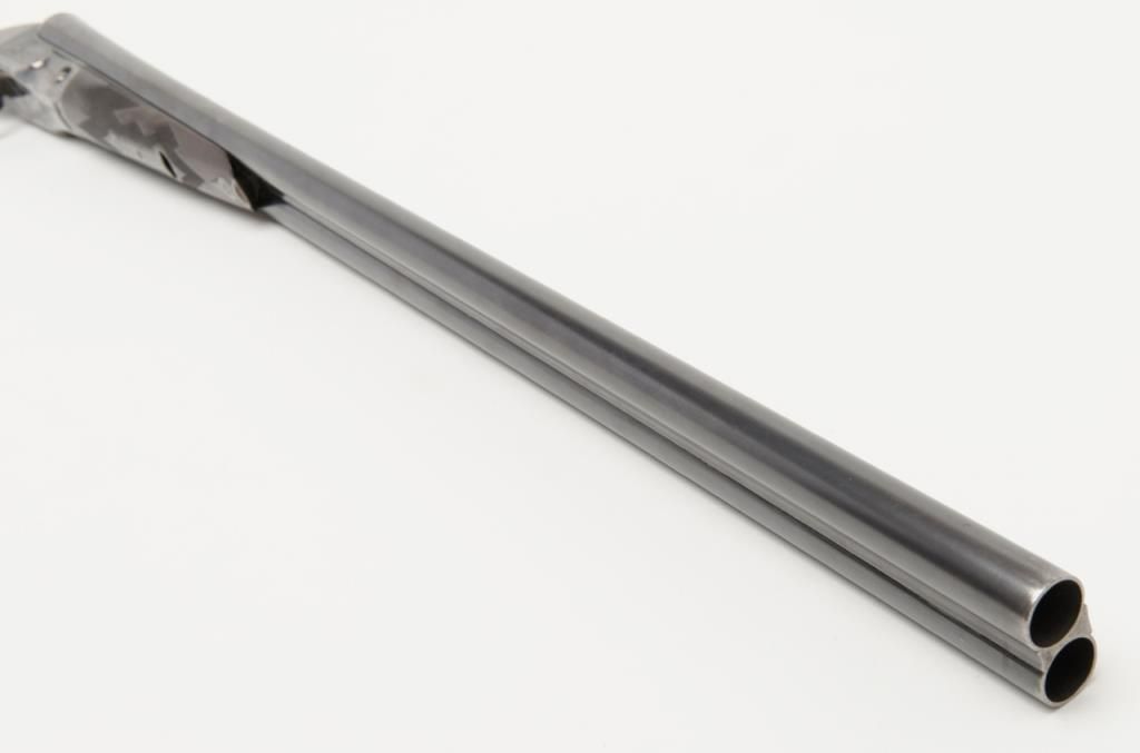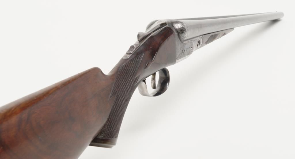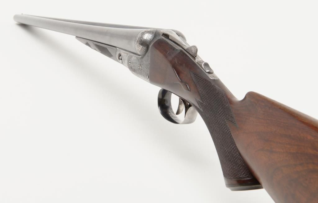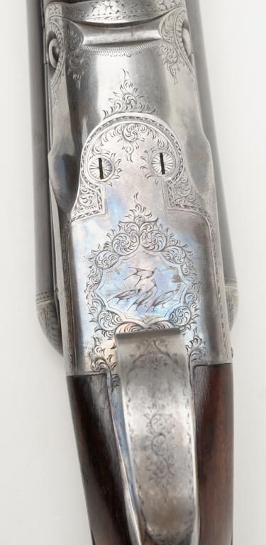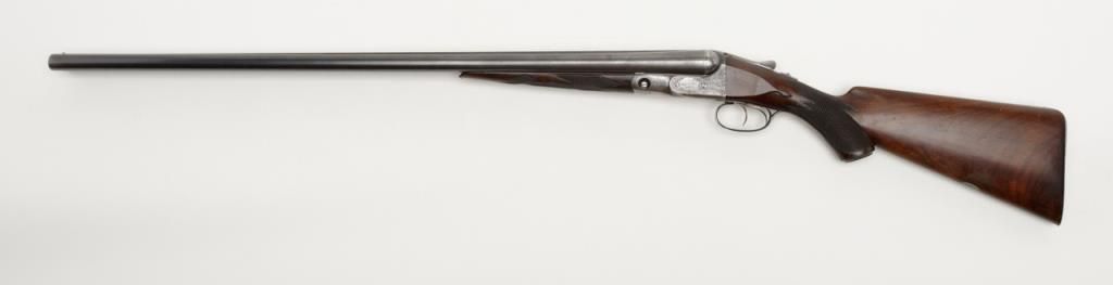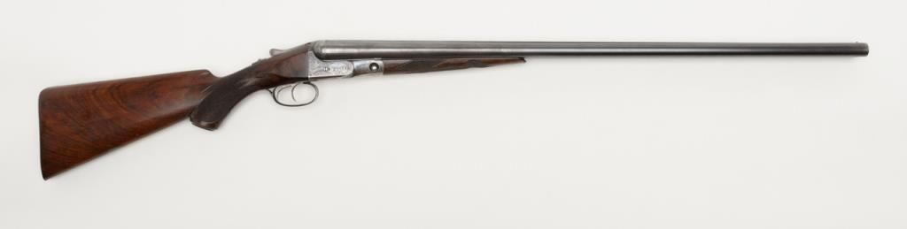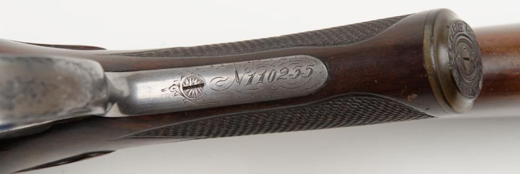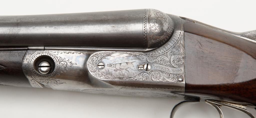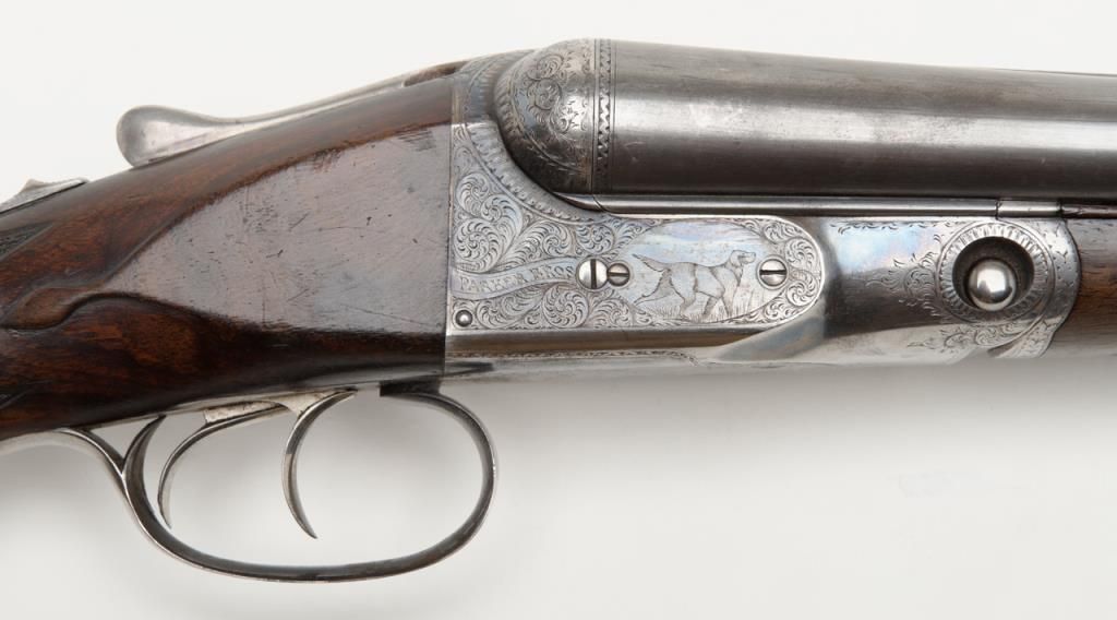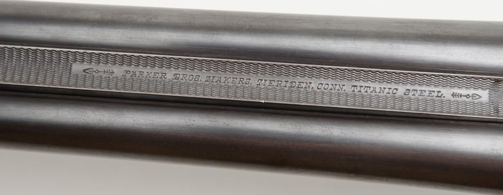 Parker D grade 12 gauge side-by-side shotgun with 30” barrels, standard triggers, standard extractors, checkered butt with skeleton plate, Titanic steel barrels, serial number 110255. The barrels retain 80% to 90% original blue that isevenly thinning and toning. The frame is very nicely engraved with dogs on both sides and game birds and the bottom. The frame retains 50% plus original case hardening drifting to silver with some good colors still showing but light. Thestock is in good to very good condition with fairly crisp checkering and a nice grain and just normal aging. The stock measures 14 ¼” to the end of the original butt. The gun locks up tight and the bores are very good plus. This Parker ischoked modified right and improved modified left. A very attractive D grade with a lot of original color. Est.: $3750-$7500