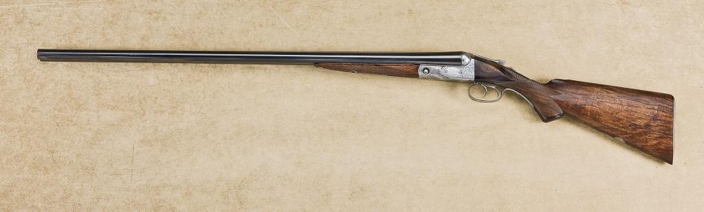 Parker DH-grade 12ga double-barrel shotgun, 32” barrels, double triggers, standard extractors, titanic steel marked barrels, skeleton steel buttplate with checkered butt, sn “N115335”. The barrels show approx. 90-95% old reblued finish now drifting to patina, some scratches and losses, slight aging. The markings and edges are fairly sharp. The frame has been lightly cleaned to a grey patina and shows well to fine engraving. The stocks are good, showing light refreshing and retracing to the checkering. The action is tight, the bore is bright. The left barrels shows only Patent mark, the right barrel shows the initial “K”, a large “4”, a small “7” right behind the 4, and a “3” near the breech. The rear lug shows “2” indicating the large frame. Est.: $1,400-$2,800