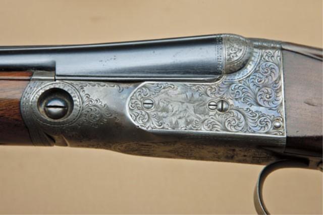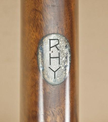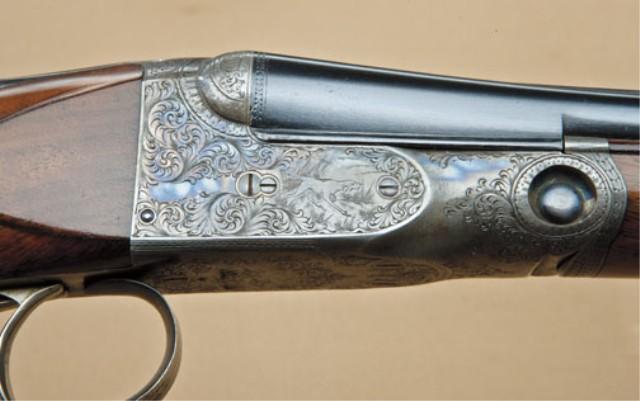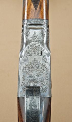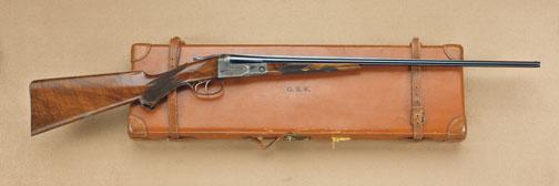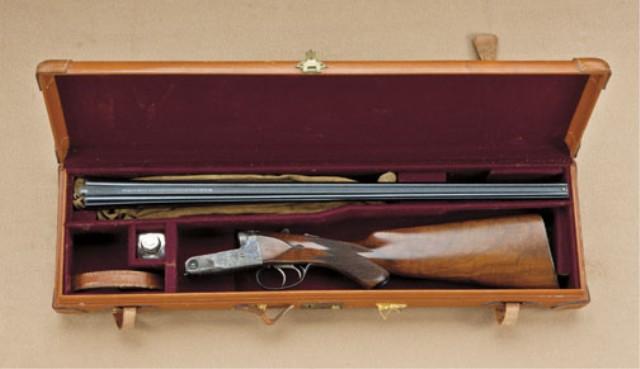 Parker DHE grade .410ga side by side shotgun, 26” barrels, Triple-O size frame, checkered pistol grip stock, skeleton buttplate with checkered panel, serial #236215. The gun remains in near fine original condition with 90-95% original blue on titanic steel marked barrels, just some slight beginning age and a couple of slight scratches. The frame shows 60-70% original case hardening, evenly toning and drifting to grey with some colorful and bright areas, particularly beneath the lever and where protected. The stocks are very good plus to near fine with crisp checkering, slight normal aging, and a silver owner’s plaque is inlaid into the belly of the stock, engraved with the initials “R.H.Y.” The barrels show overload proofs on the bottom of the breech, “T” in a circle, the number “3” with “410” and OOO marked on the lug, and K inspection mark and the barrels are matching. The interior of the barrels are bright showing just some slight use. The gun locks tight, the forend is also in sharp condition with traces of case hardening on the latch, matches the finish on the stock perfectly, and the gun is all original. The gun is contained within an associated trunk casing which is very good. The