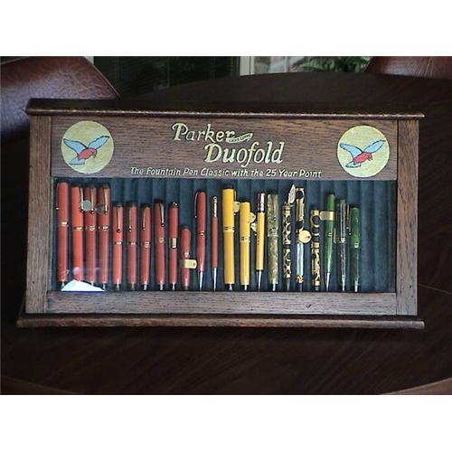 Vintage parker Lucky curve store display case ca. 1890-1900 made of oak wood with felt lining inside. REFINISHED and due to age the grooved pen bed is ever so slightly warped at right side.Pens inside the cabinet NOT INCLUDED in the sale. Will ship worldwide. Insurance recommended.