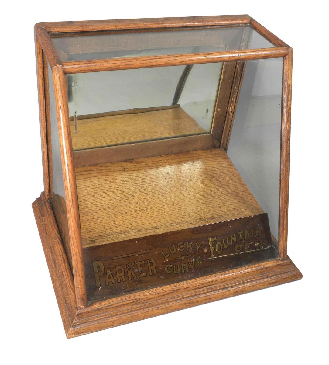 Parker Fountain Pen Slant Front Oak Display Cabinet. Some scratches to the interior wood sign, otherwise very good condition. 17 X 14 3/4 X 12 1/2 inches.