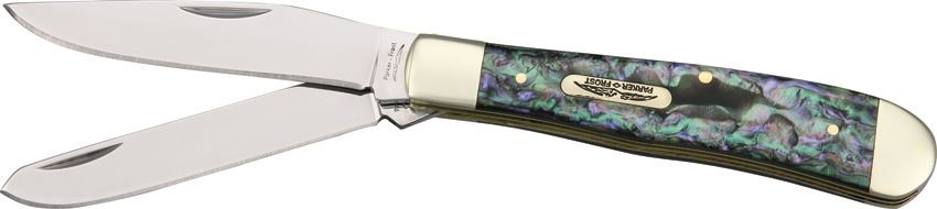 4 1/8" closed. 440 stainless clip and spey blades. Master blade is etched Next Generation. Imitation abalone handles with nickel silver bolsters. Parker/Frost inlay shield. The Next Generation - produced for James "Buzz" Parker and Stephen J. Frost. First generation Parker - Frost knives were produced almost 40 years ago.